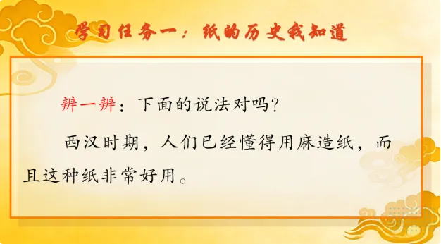 学习任务一:纸的历史我知道师:那我们来试试,第一个,什么任务呢?谁来读?你来读。