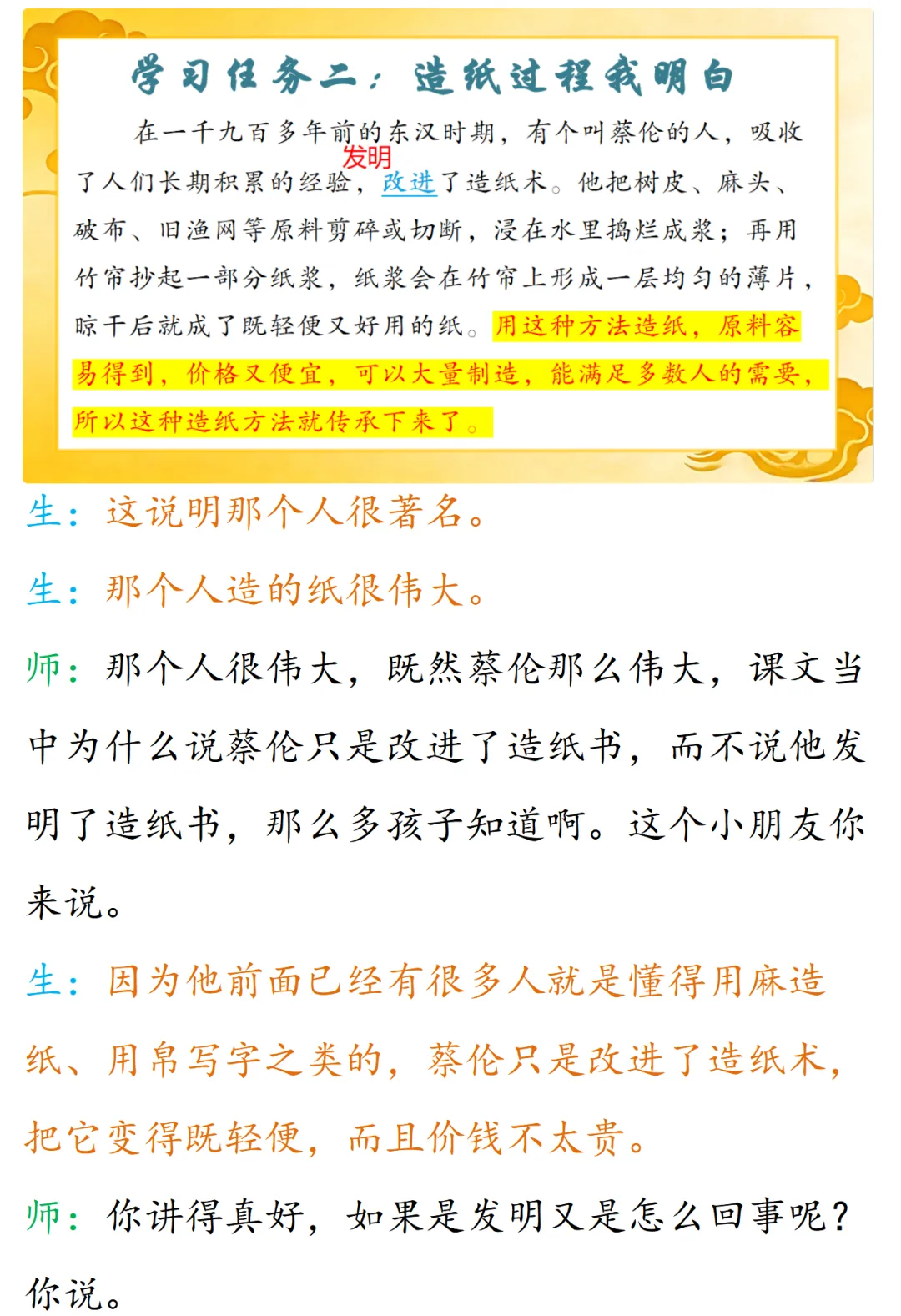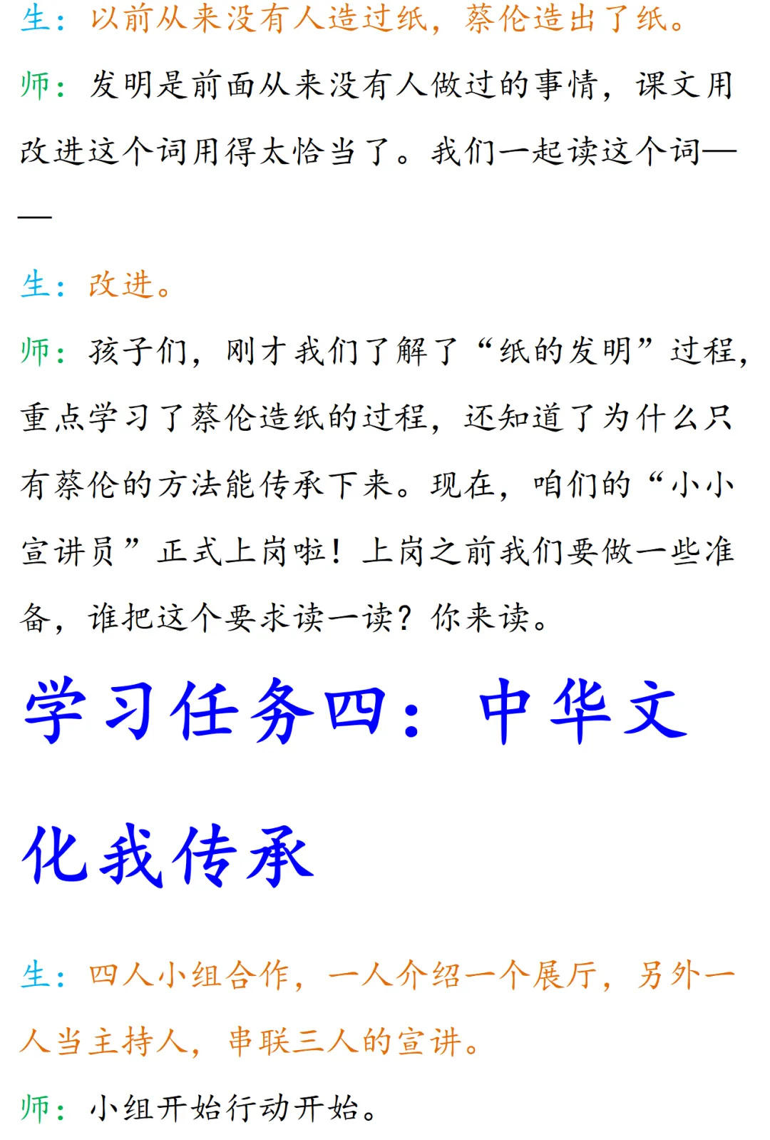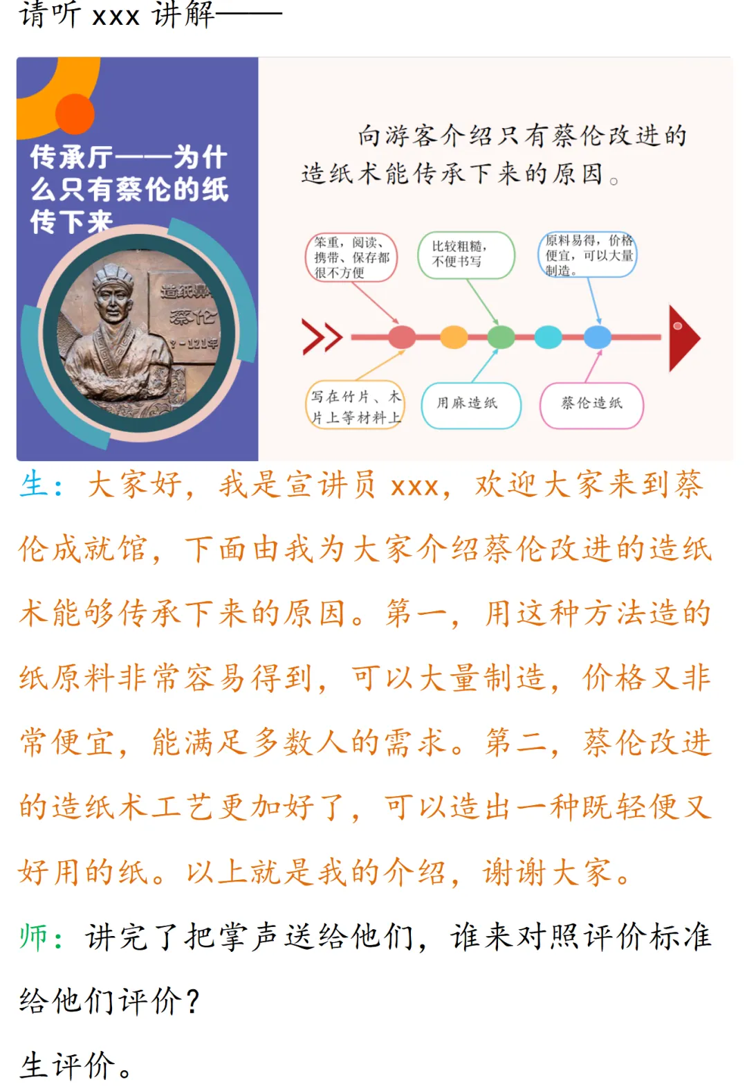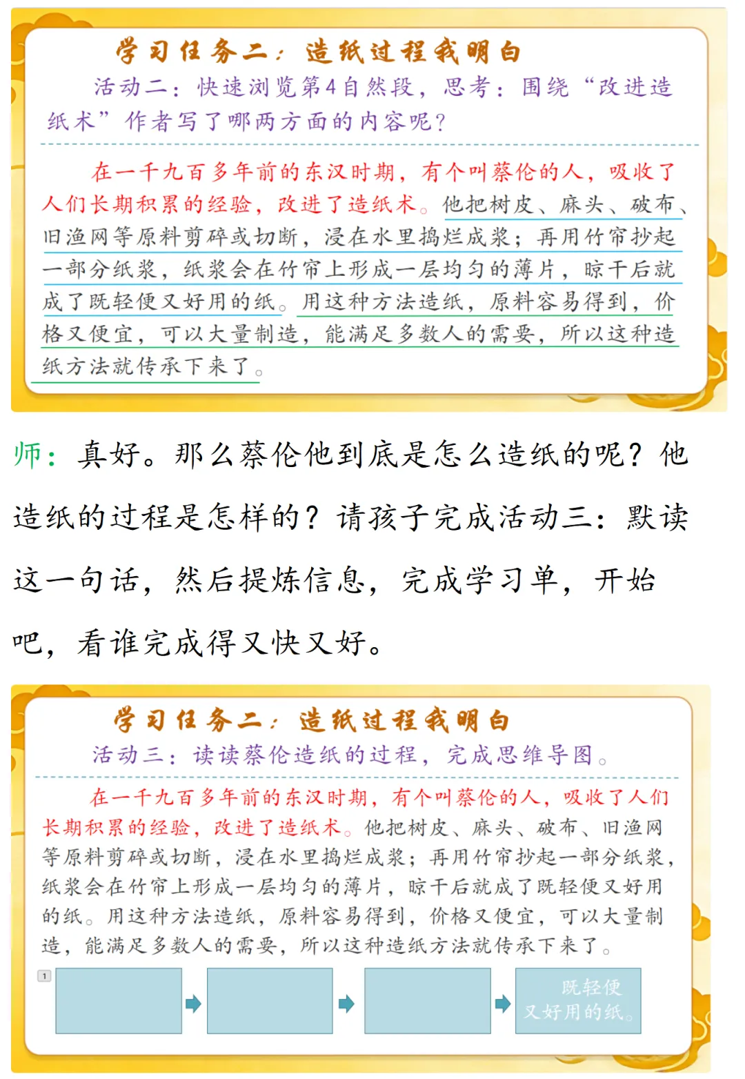 说明:这节课用到了一个ai生成的动态视频,就是造纸博物馆,其他的没用上。纸的历史我知道,这个环节通过不同的问题引导学生回顾上节课的知识。学习任务二:造纸过程我知道,第一个活动引导学生通过找关键句概括东汉时期,蔡伦改进造纸术,巩固运用第三单元所学知识。活动二:围绕“改进造纸术”作者写了哪两方面的内容呢?这个问题是带领学生了解课文是怎么围绕一个意思把段话写清楚的,契合本单元的语文要素。至于课后习题为什么蔡伦的造纸术能够传承下来,我通过一个思维导图,让学生比较,其他造纸术的缺点,然后找出蔡伦造纸术的优点,这么一比较就知道原因了。任务三,进行宣讲,则是安排小组活动,让每个人都能参与,评价标准也很全面。