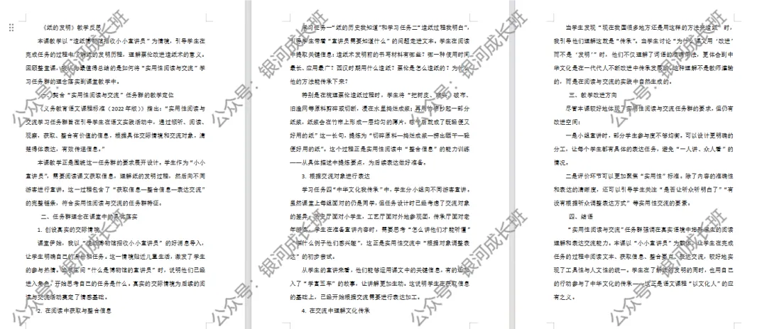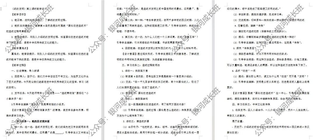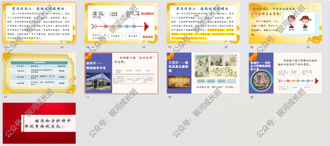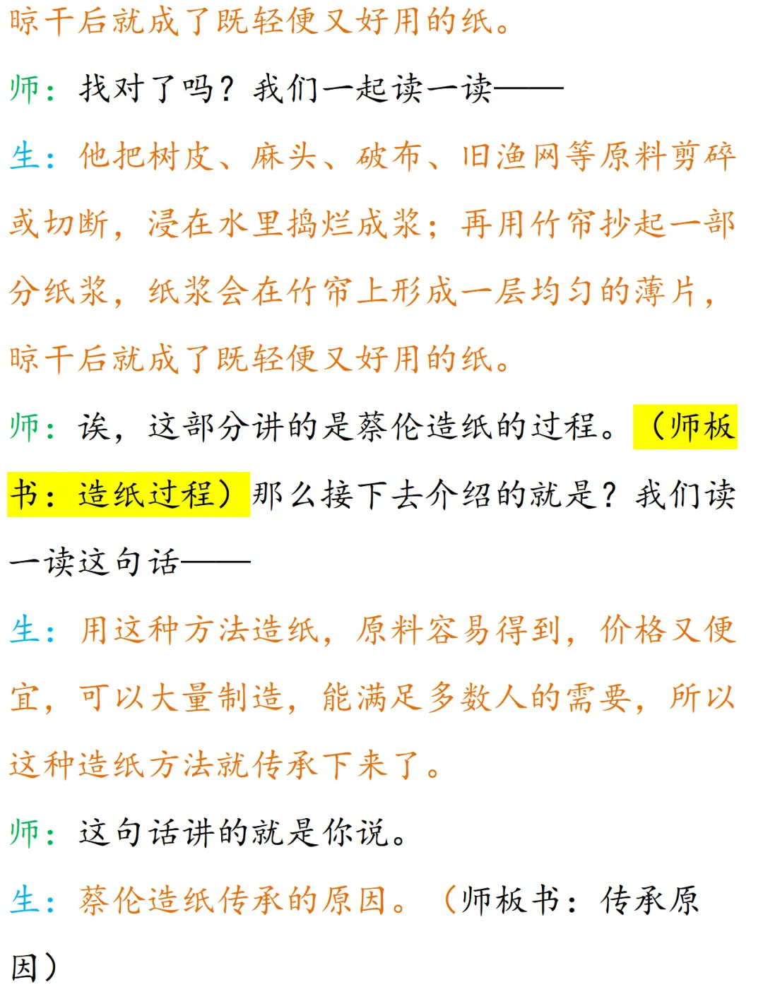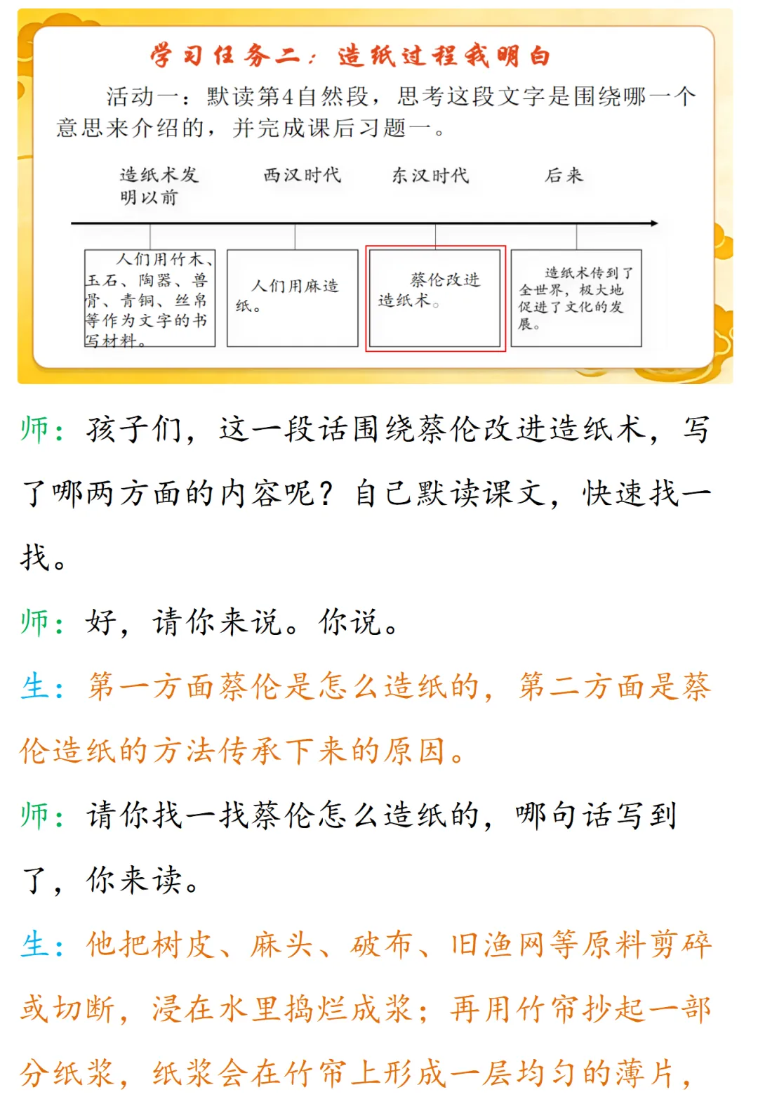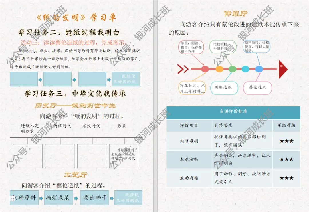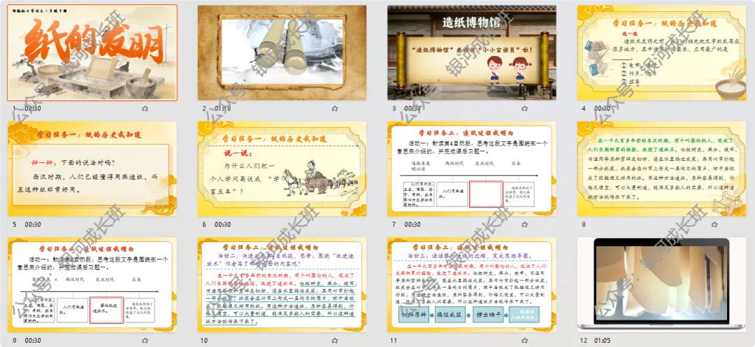 说明:这节课用到了一个ai生成的动态视频,就是造纸博物馆,其他的没用上。纸的历史我知道,这个环节通过不同的问题引导学生回顾上节课的知识。学习任务二:造纸过程我知道,第一个活动引导学生通过找关键句概括东汉时期,蔡伦改进造纸术,巩固运用第三单元所学知识。活动二:围绕“改进造纸术”作者写了哪两方面的内容呢?这个问题是带领学生了解课文是怎么围绕一个意思把段话写清楚的,契合本单元的语文要素。至于课后习题为什么蔡伦的造纸术能够传承下来,我通过一个思维导图,让学生比较,其他造纸术的缺点,然后找出蔡伦造纸术的优点,这么一比较就知道原因了。任务三,进行宣讲,则是安排小组活动,让每个人都能参与,评价标准也很全面。