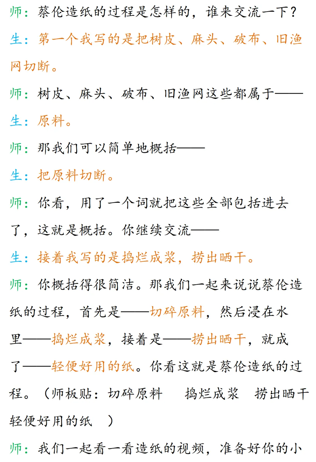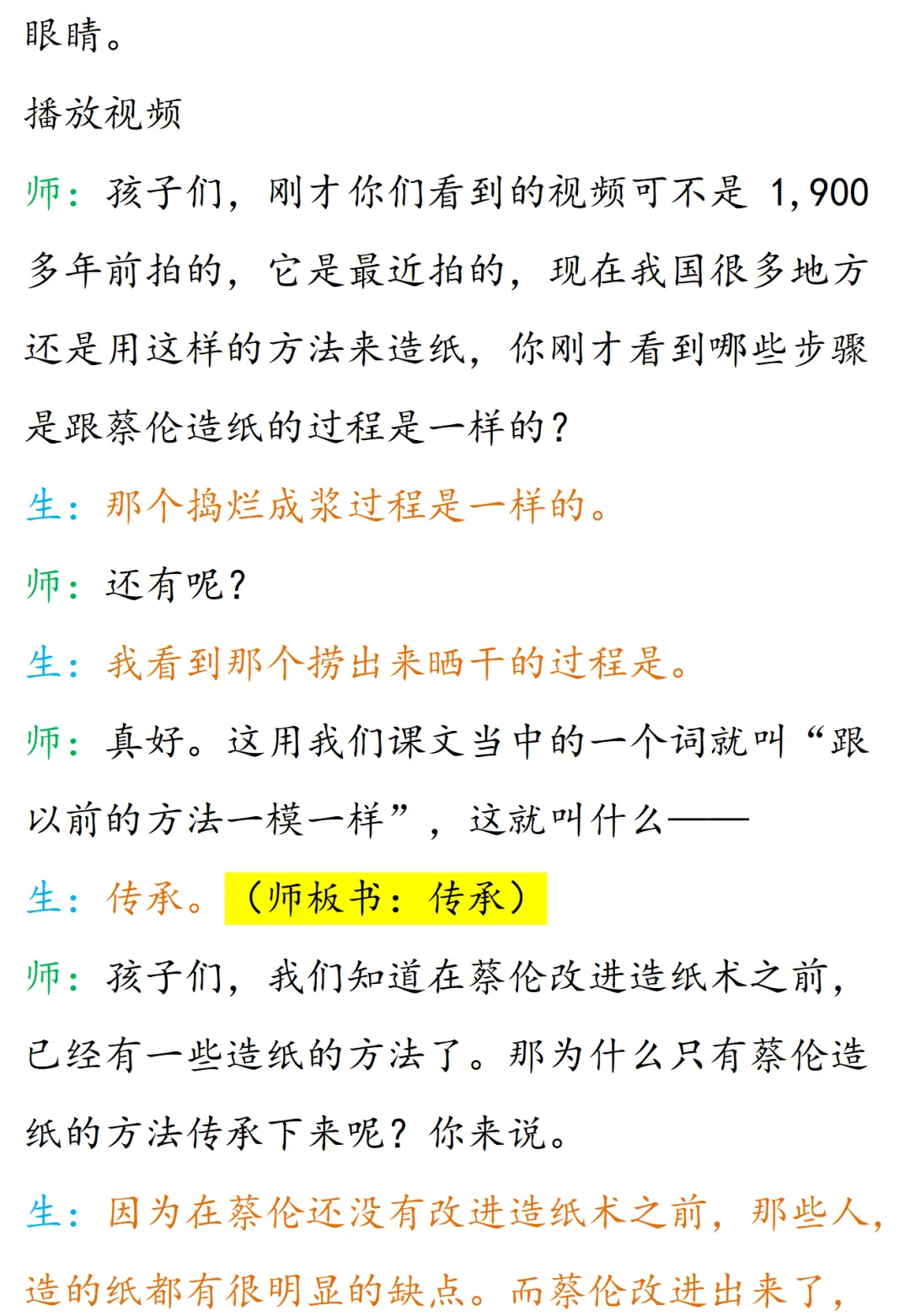 师:上课。孩子们,我们大中华悠悠五千年文化,为世界文化作出了巨大的贡献,许许多多优秀的文化传承至今。今天就让我们继续走进中华优秀传统文化的宝库,继续来学习,一起读——生:纸的发明。