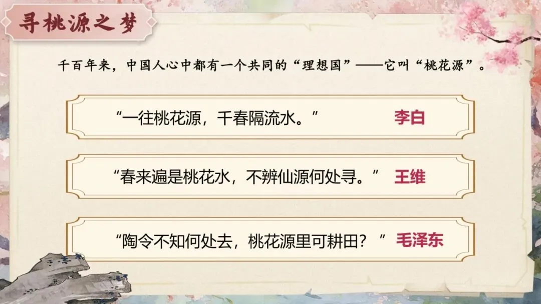 过渡:文末说"后遂无问津者",但千百年来,“桃花源”从未被人们遗忘,李白、王维等文人都曾写下桃源主题的诗句。
