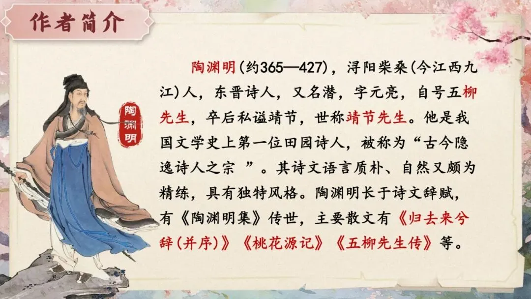 陶渊明(约365—427),浔阳柴桑(今江西九江)人,东晋诗人,又名潜,字元亮,自号五柳先生,卒后私谥靖节,世称靖节先生。他是我国文学史上第一位田园诗人,被称为“古今隐逸诗人之宗 ”。其诗文语言质朴、自然又颇为精练,具有独特风格。陶渊明长于诗文辞赋,有《陶渊明集》传世,主要散文有《归去来兮辞(并序)》《桃花源记》《五柳先生传》等。