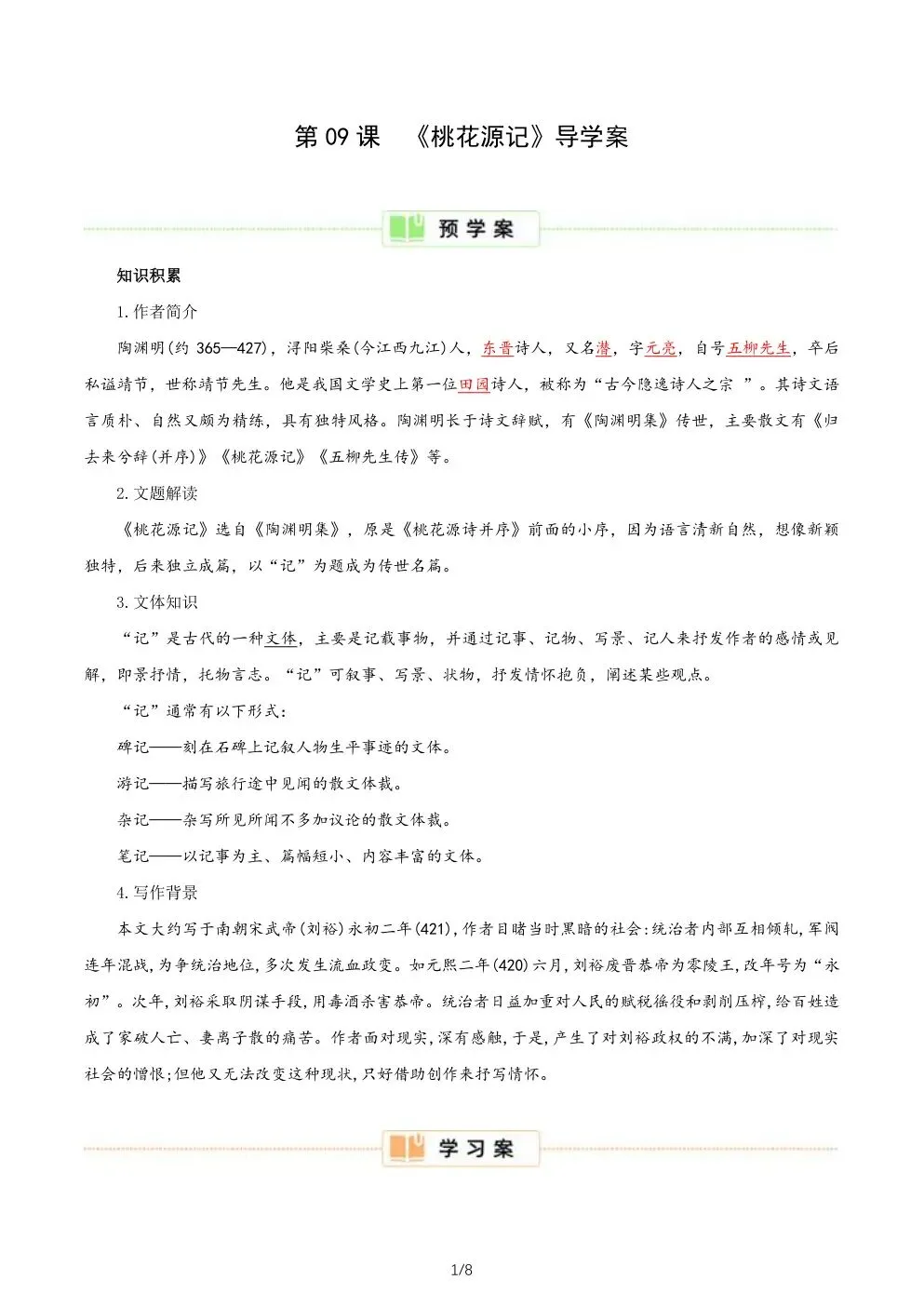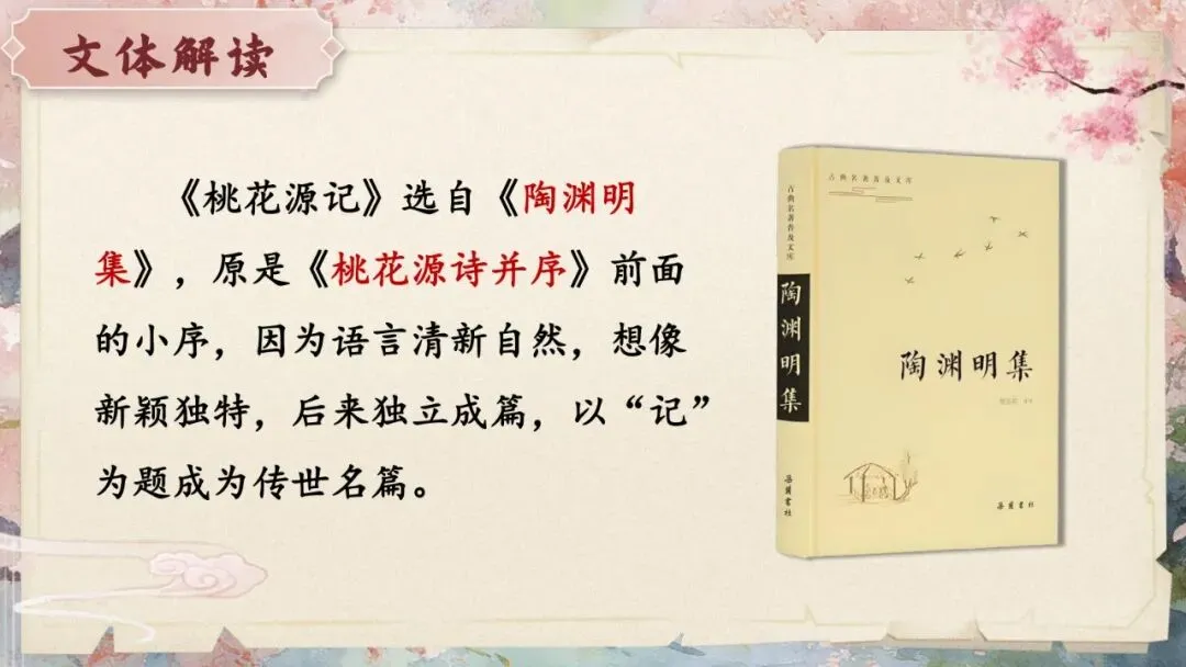 《桃花源记》选自《陶渊明集》,原是《桃花源诗并序》前面的小序,因为语言清新自然,想像新颖独特,后来独立成篇,以“记”为题成为传世名篇。