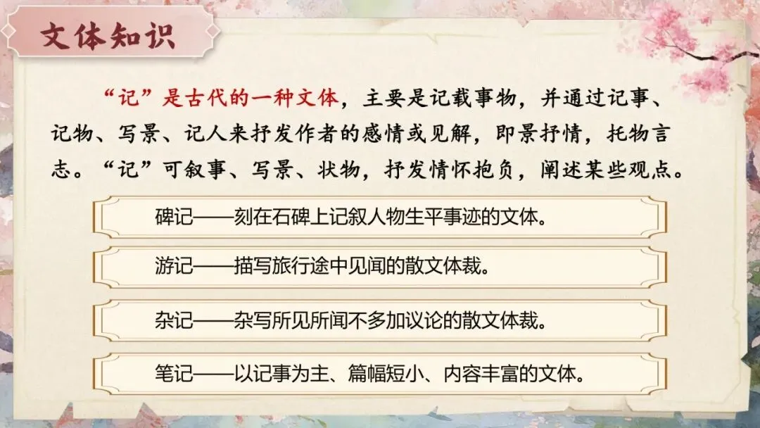 “记”,古代的一种文体,主要是记载事物,并通过记事、记物、写景、记人来抒发作者的感情或见解,即景抒情,托物言志。“记”可叙事、写景、状物,抒发情怀抱负,阐述某些观点。