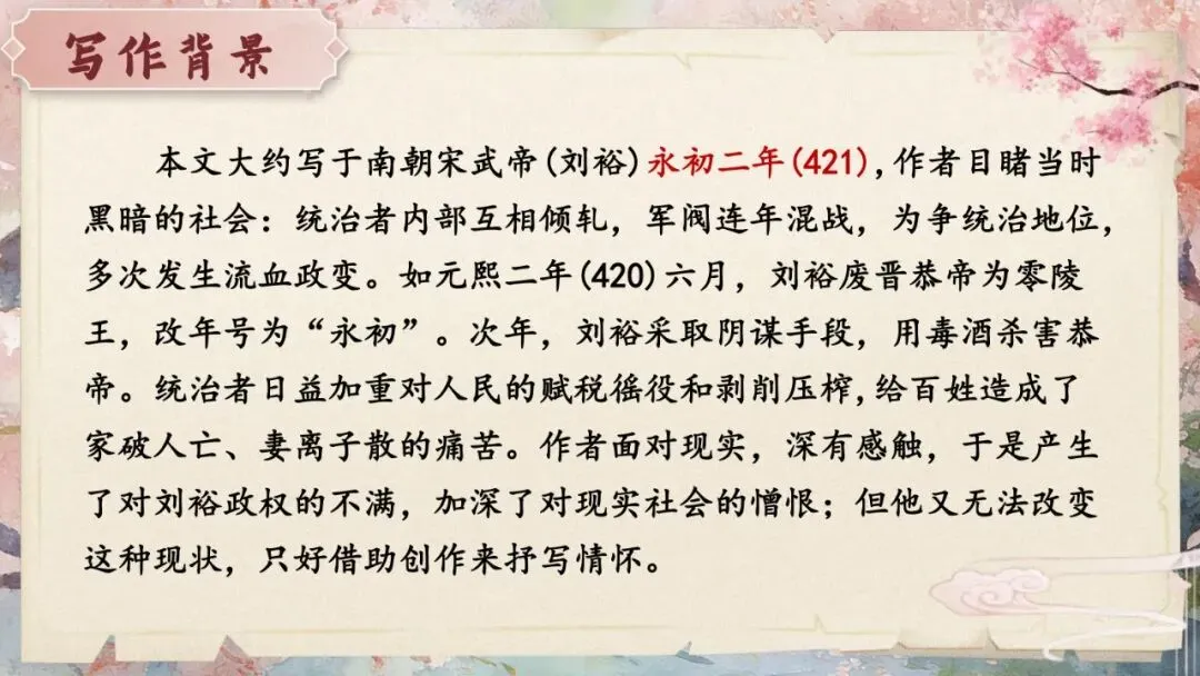 本文大约写于南朝宋武帝(刘裕)永初二年(421),作者目睹当时黑暗的社会:统治者内部互相倾轧,军阀连年混战,为争统治地位,多次发生流血政变。如元熙二年(420)六月,刘裕废晋恭帝为零陵王,改年号为“永初”。次年,刘裕采取阴谋手段,用毒酒杀害恭帝。统治者日益加重对人民的赋税徭役和剥削压榨,给百姓造成了家破人亡、妻离子散的痛苦。作者面对现实,深有感触,于是,产生了对刘裕政权的不满,加深了对现实社会的憎恨;但他又无法改变这种现状,只好借助创作来抒写情怀。