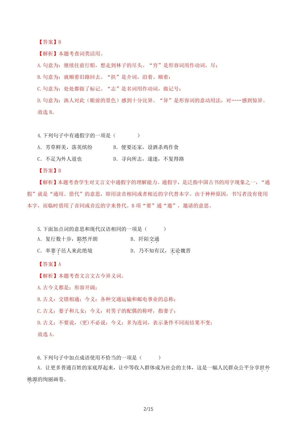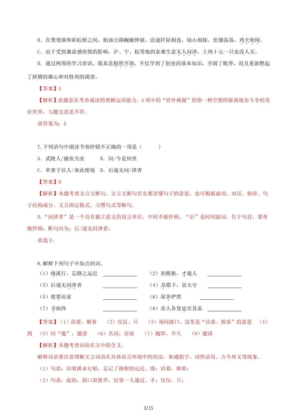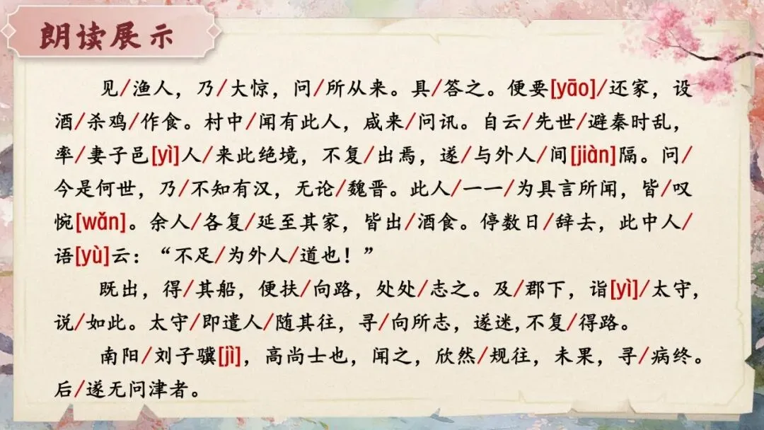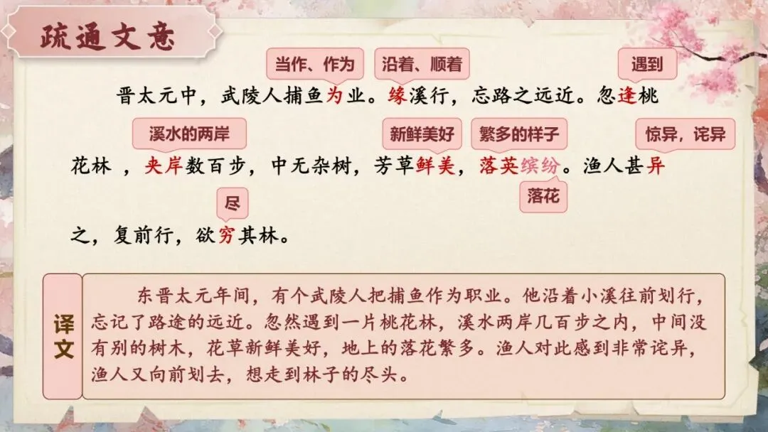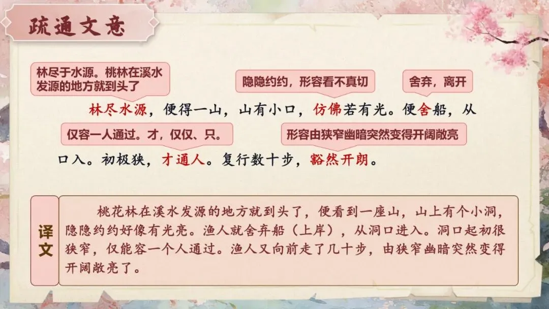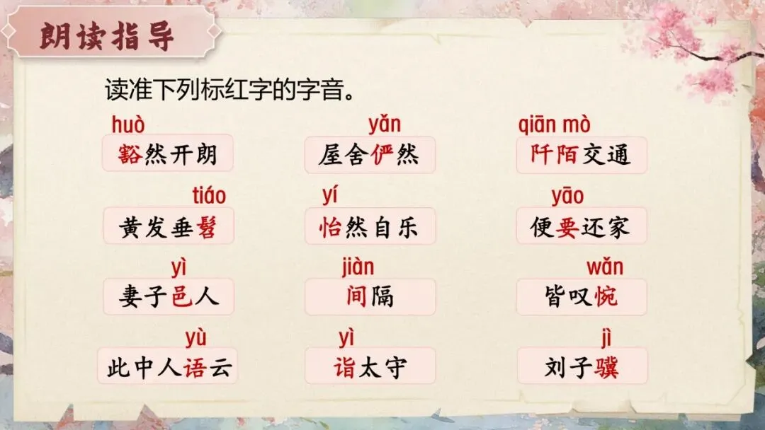 语言运用:准确诵读课文,积累“为、舍、寻”等一词多义现象;结合新注释理解“黄发垂髫”“绝境”“叹惋”等词语的精准含义。