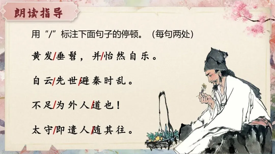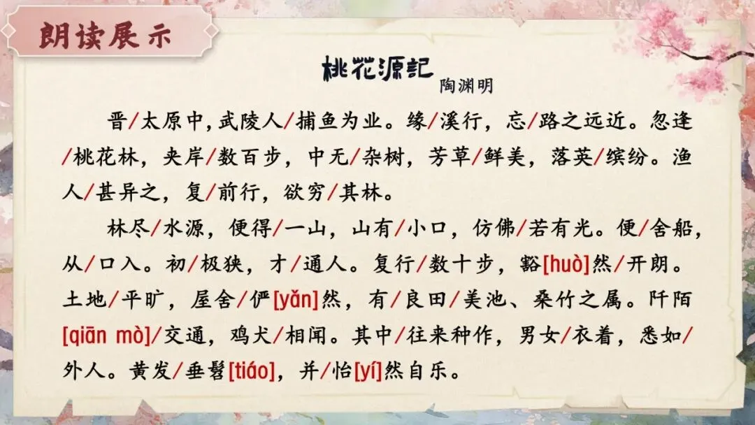 林尽/水源,便得/一山,山有/小口,仿佛/若有光。便/舍船,从/口入。初/极狭,才/通人。复行/数十步,豁[huò]然/开朗。土地/平旷,屋舍/俨[yǎn]然,有/良田/美池、桑竹之属。阡陌[qiān mò]/交通,鸡犬/相闻。其中/往来种作,男女/衣着,悉如/外人。黄发/垂髫[tiáo],并/怡[yí]然自乐。