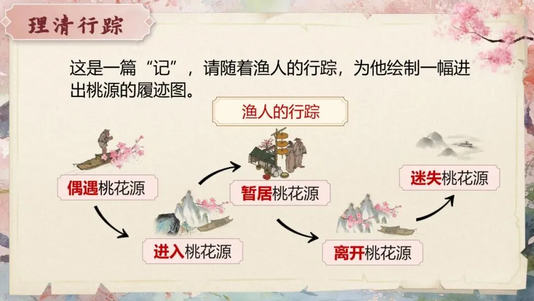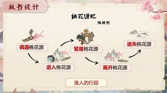 渔人的行踪:偶遇桃林→进入桃源→暂居桃源→离开桃源→迷失桃源