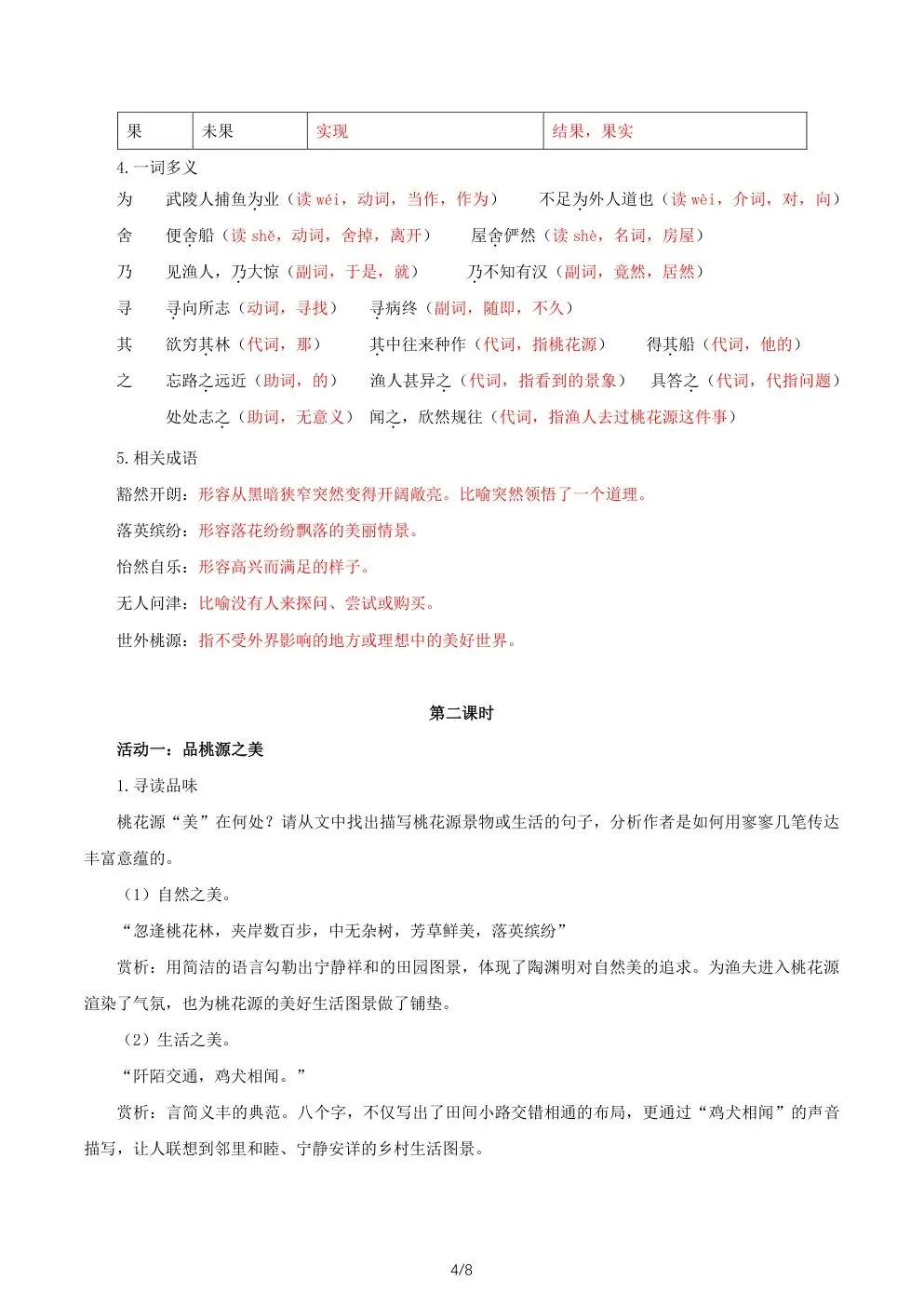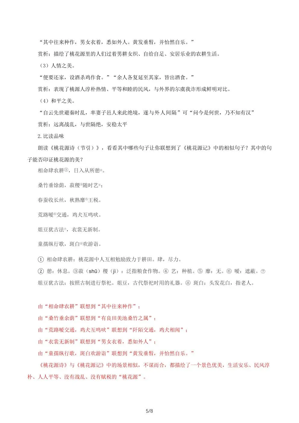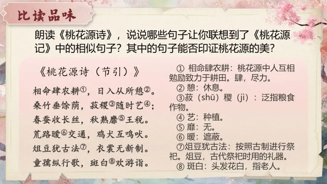 审美鉴赏:品味“芳草鲜美,落英缤纷”“土地平旷,屋舍俨然”等语句,感受桃花源的自然与人文之美,体会陶渊明质朴自然的语言风格。