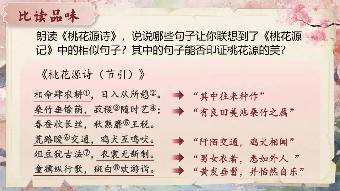 朗读《桃花源诗(节引)》,看看其中哪些句子让你联想到了《桃花源记》中的相似句子?其中的句子能否印证桃花源的美?