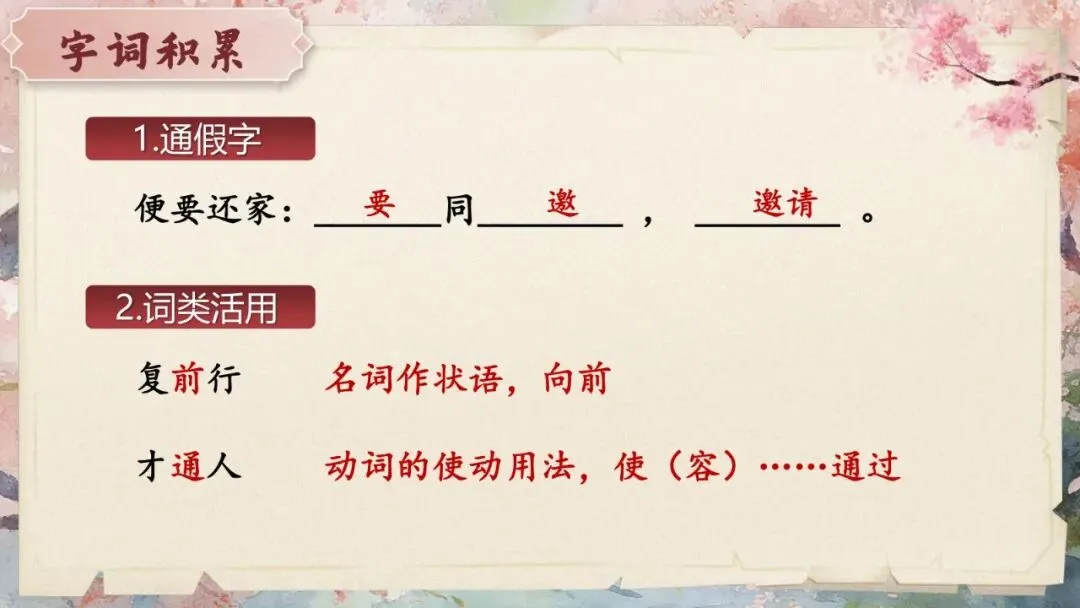 •强化一词多义训练: 响应新教材“关注文言文中的一词多义现象”的要求,系统梳理了“为、舍、乃、寻、之”等核心词汇,为学生积累文言语感奠定基础。