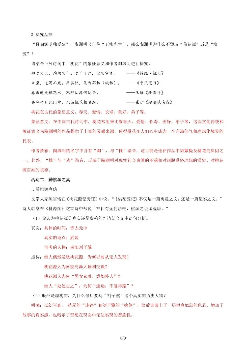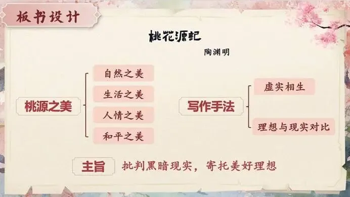思维发展:梳理渔人行踪,分析文章“虚实结合”的叙事技巧;对比桃源内外的社会图景,探究作者的写作意图。