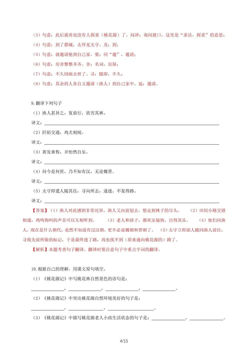赏析:用简洁的语言勾勒出宁静祥和的田园图景,体现了陶渊明对自然美的追求。为渔夫进入桃花源渲染了气氛,也为桃花源的美好生活图景做了铺垫。