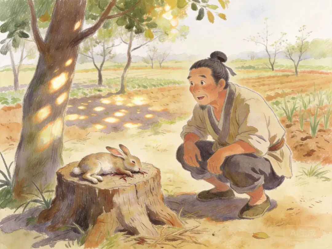 👨🏫 教师活动:1. 出示第一句“兔走触株,折颈而死”,引导学生思考:“这句话里哪个词写出了兔子撞死的意外性?”2. 出示第二句“因释其耒而守株,冀复得兔”,提问:“‘因’是什么意思?农夫为什么会放下农具守株?‘冀’字体现了他什么心理?”3. 出示第三句“兔不可复得,而身为宋国笑”,组织小组讨论:“为什么兔子再也没来?农夫为什么会被宋国人笑话?”