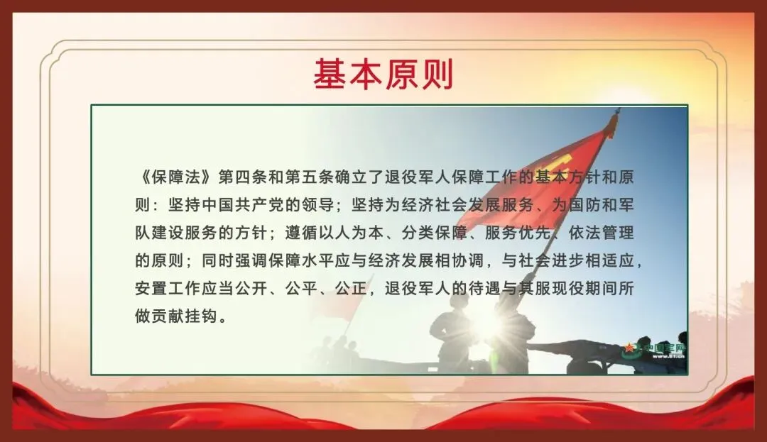 关于基本原则,《保障法》第四条和第五条确立了退役军人保障工作的基本方针和原则:坚持中国共产党的领导;坚持为经济社会发展服务、为国防和军队建设服务的方针;遵循以人为本、分类保障、服务优先、依法管理的原则;同时强调保障水平应与经济发展相协调,与社会进步相适应,安置工作应当公开、公平、公正,退役军人的待遇与其服现役期间所做贡献挂钩。这些原则并非空洞的口号,而是具体制度设计的指导思想和价值尺度。例如,“分类保障”原则直接体现在后续章节对不同类别退役军人(军官、军士、义务兵)采取差异化安置方式的规定中;“贡献挂钩”原则则具体化为对参战退役军人、功臣模范等的优先安置和特殊优待。