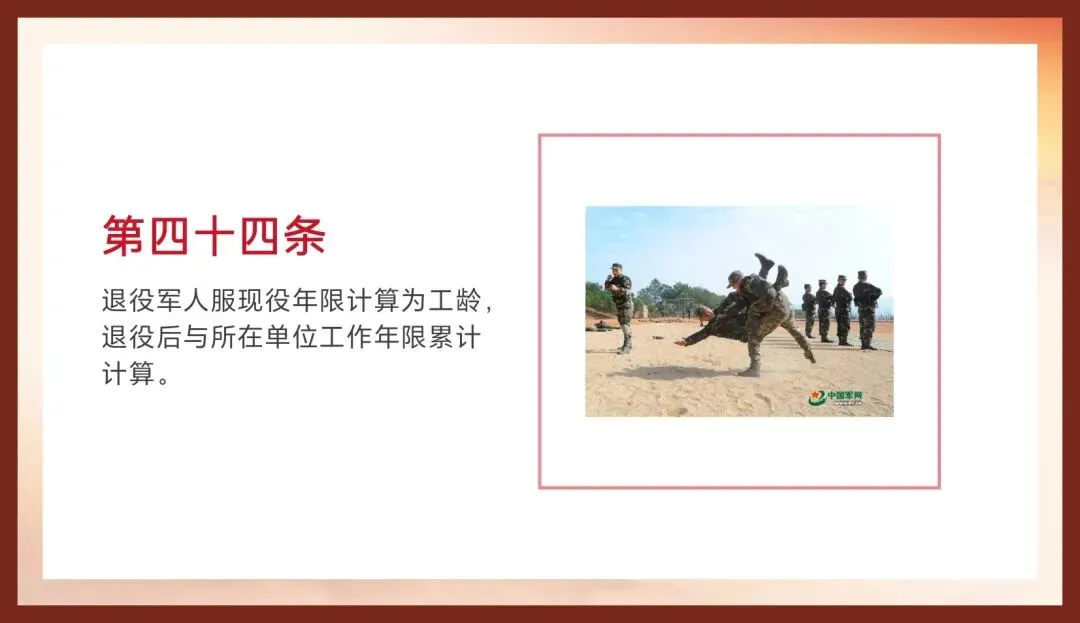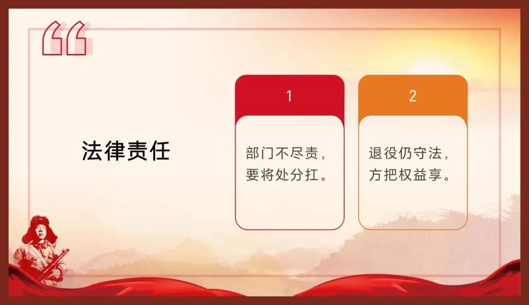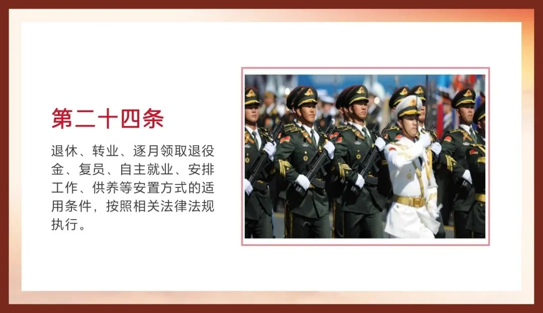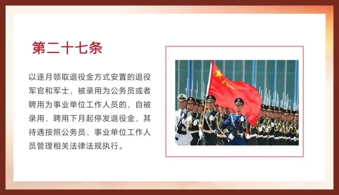 关于退役军人的权利义务。国家关心、优待退役军人,加强退役军人保障体系建设,保障退役军人依法享有相应的权益,同时明确退役军人应当继续发扬人民军队优良传统,模范遵守宪法和法律法规。