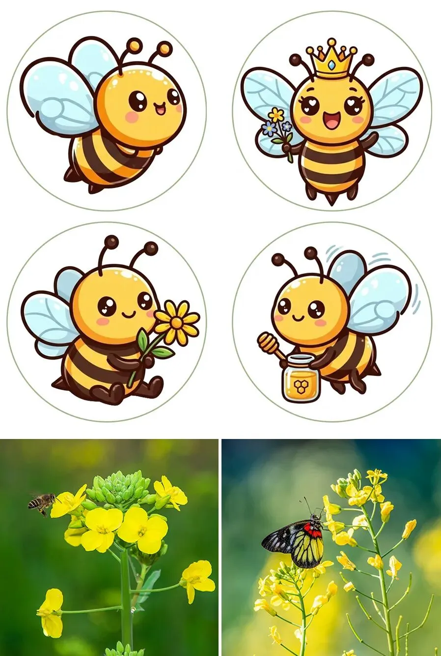 如果我们仔细观察油菜花,会发现它是由许多小小的花朵组成的,一朵挨着一朵,像一串串金色的小铃铛。细长的绿色花茎把这些小花高高托起,旁边还有绿色的叶子,让黄色的花朵看起来更加明亮。在这样香香的花田里,常常会有很多小昆虫来做客,比如飞舞的蝴蝶、小瓢虫,还有最勤劳的小伙伴——蜜蜂。蜜蜂一边采花蜜,一边帮助花朵传播花粉,是油菜花最好的朋友。