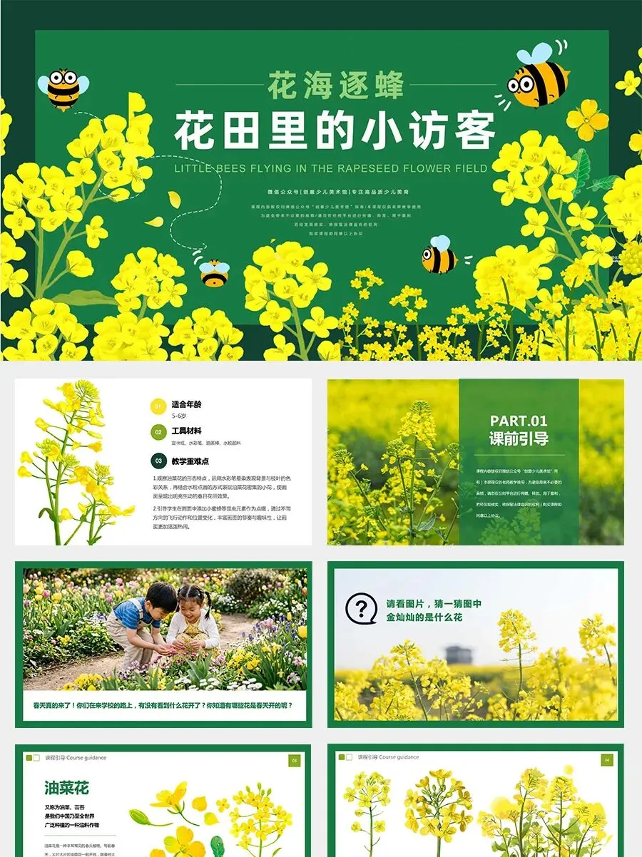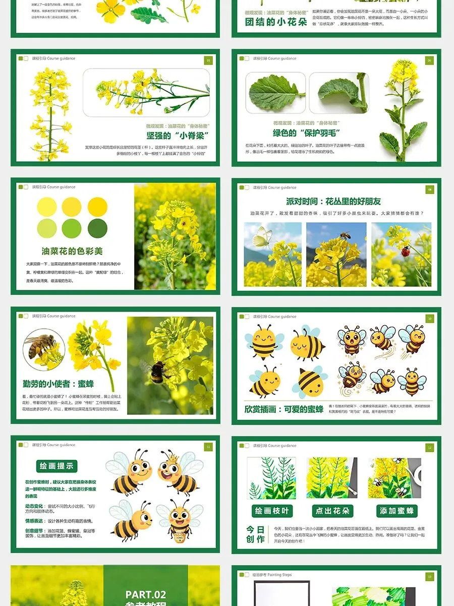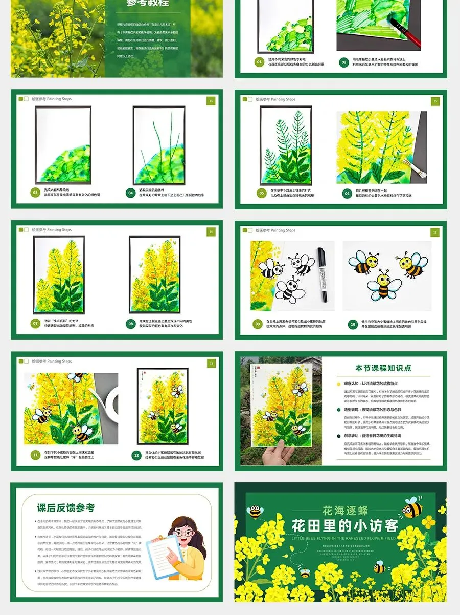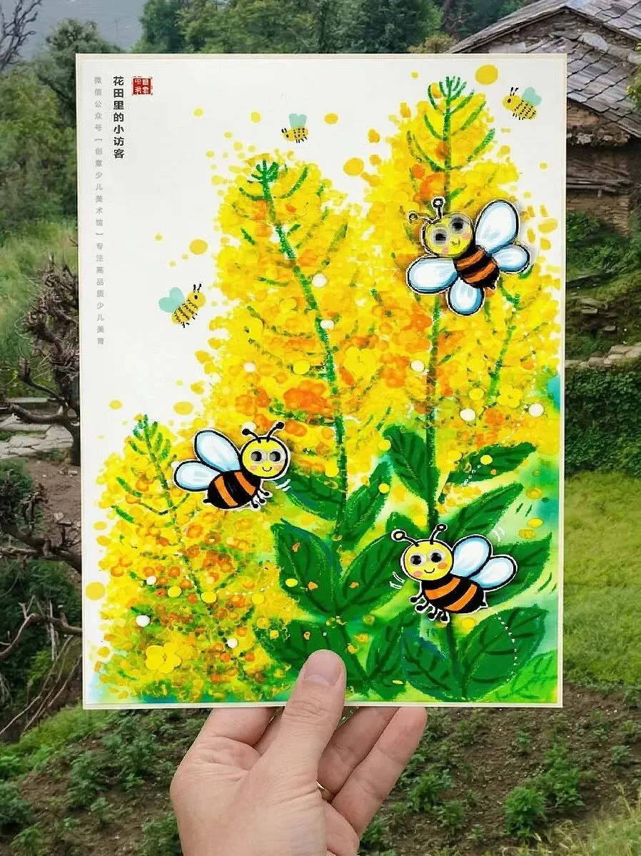 今天,我们也要当一次小小画家,把春天的油菜花田画在画纸上。我们可以画出高高的花茎、金黄色的小花朵,还有在花丛中飞舞的小蜜蜂,让画面变得更加生动、热闹。准备好了吗?让我们一起开启今天的创作吧!