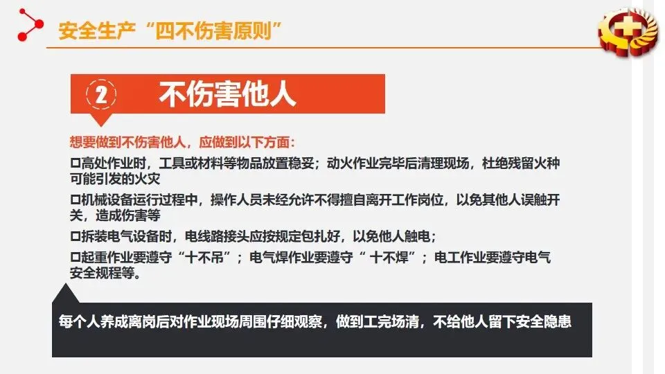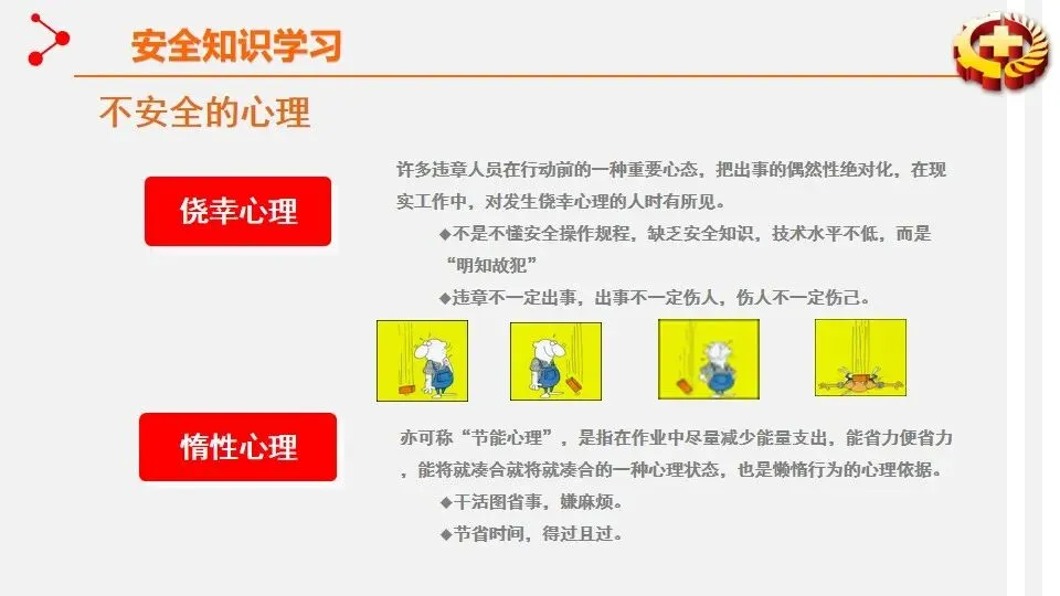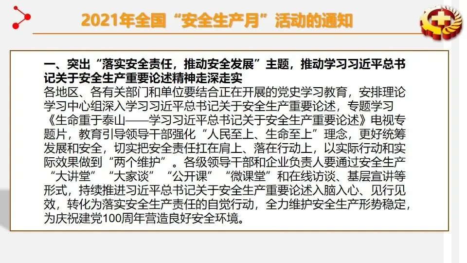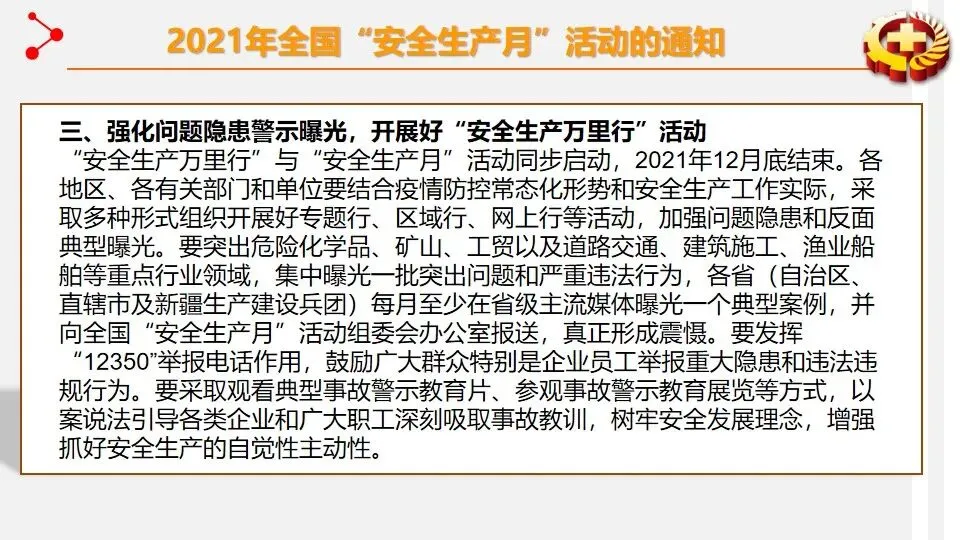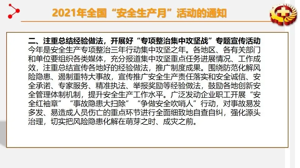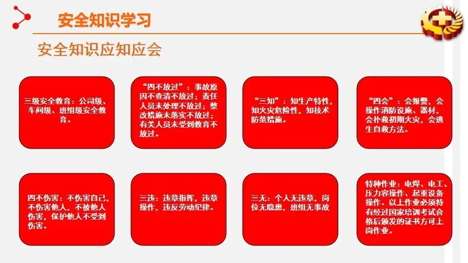 报告聚焦安全生产专项整治三年行动集中攻坚,通过多形式活动强化安全理念传播。宣讲围绕安全意识提升、知识学习、技能掌握及行业禁令等核心内容展开。安全意识提升环节强调风险的普遍性,结合墨菲理论与海因里希法则,指出事故源于隐患积累,需摒弃侥幸与麻痹心理。安全知识学习涵盖三级安全教育、劳动防护用品使用、电气与设备操作规范等,明确 “四不伤害”“三违” 等核心原则。安全技能部分重点讲解火灾扑救、触电急救、应急逃生等实操方法,细化灭火器与消防栓使用流程。行业安全禁令明确电焊气割、起重作业、高处作业等多领域 “十不准” 要求,划定安全红线。宣讲旨在通过全方位培训,推动安全责任落实,提升全员安全素养,从源头防范安全风险。