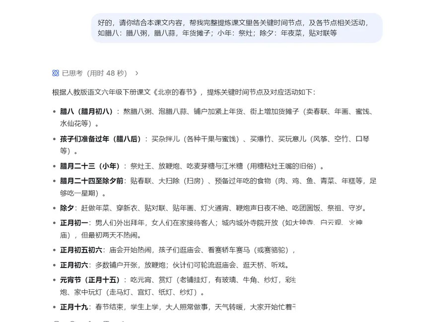 📌 提示词:请你结合本课文内容,帮我完整提炼课文里各关键时间节点,及各节点相关活动,如腊八:腊八粥,腊八蒜,年货摊子;小年:祭灶;除夕:年夜菜,贴对联等