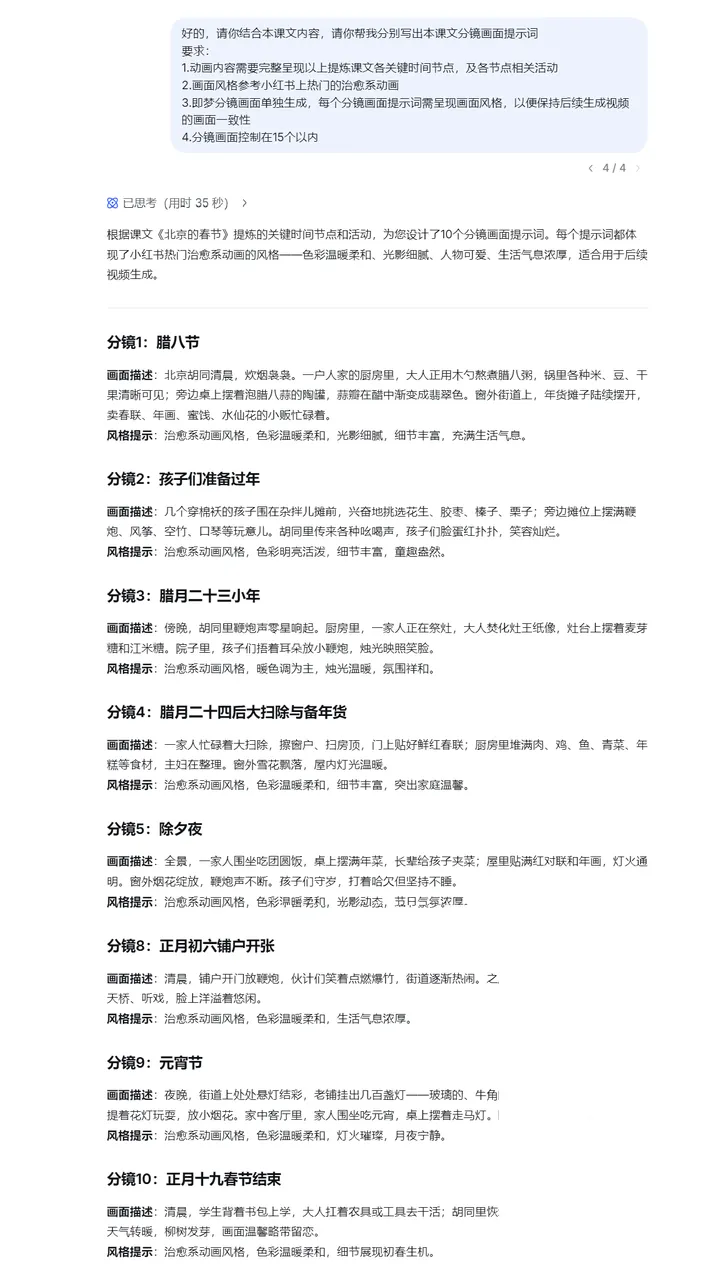 🌅 提示词:请你结合本课文内容,帮我分别写出本课文分镜画面提示词。要求:①动画内容完整呈现各关键时间节点及活动;②画面风格参考小红书热门治愈系动画;③每个分镜提示词需包含画面风格,保持后续视频风格一致;④分镜控制在15个以内