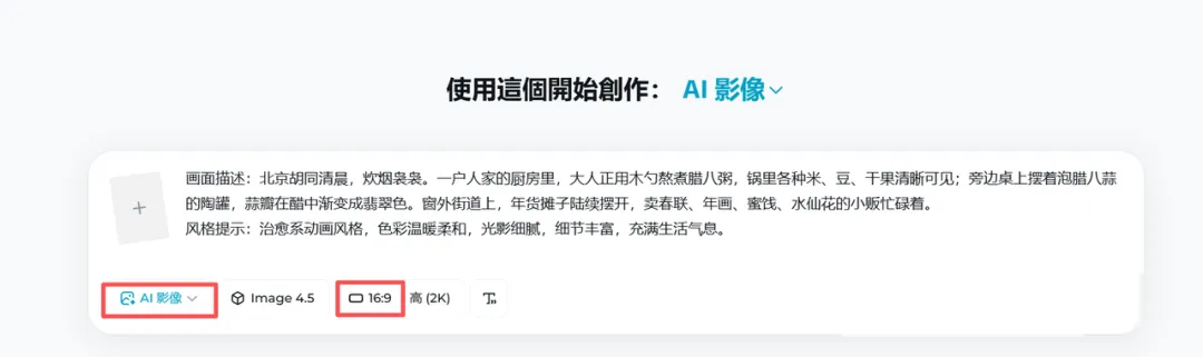 把DeepSeek给出的分镜提示词逐一输入——选择图片生成(国内版)或AI影像(国际版)——比例选16:9——生成。