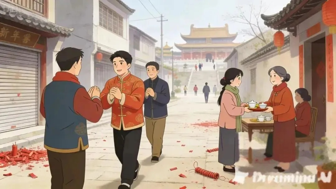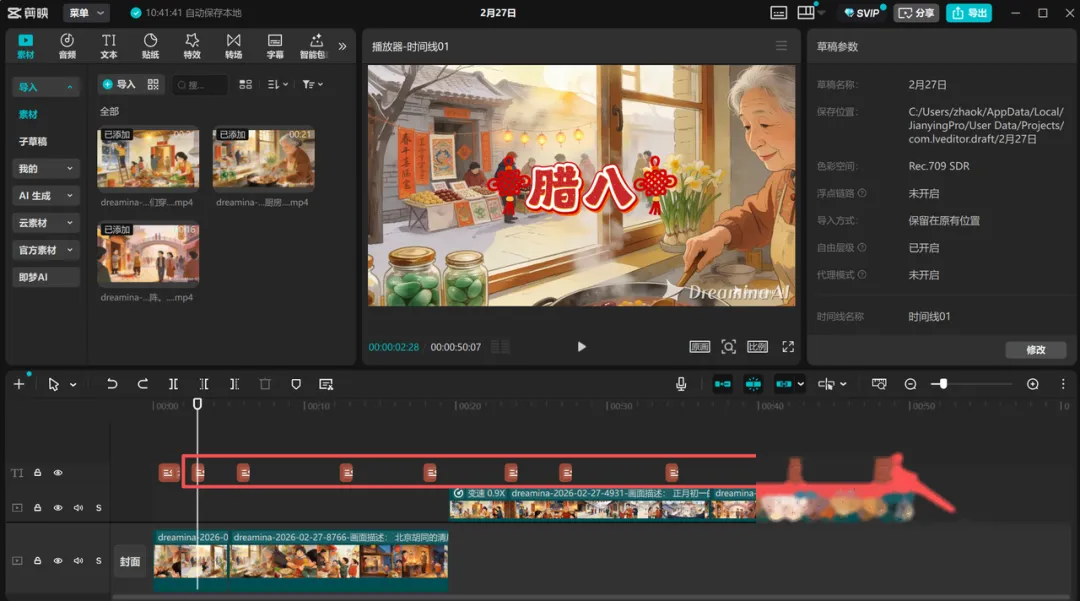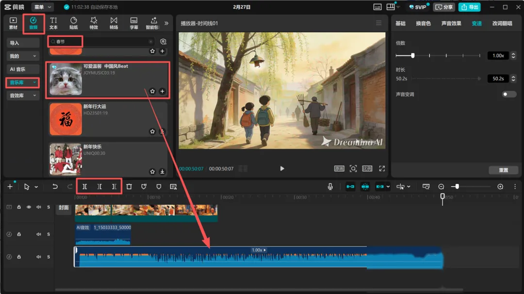 加音乐:点击"音频"——"音乐库"——"AI音效"——搜索"春节"——选好音乐加入轨道——用"分割""裁剪"调整长短。
