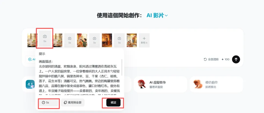 点击每张图中间的画面提示框,把DeepSeek生成的对应描述粘贴进去——时间选"5S"——确认。