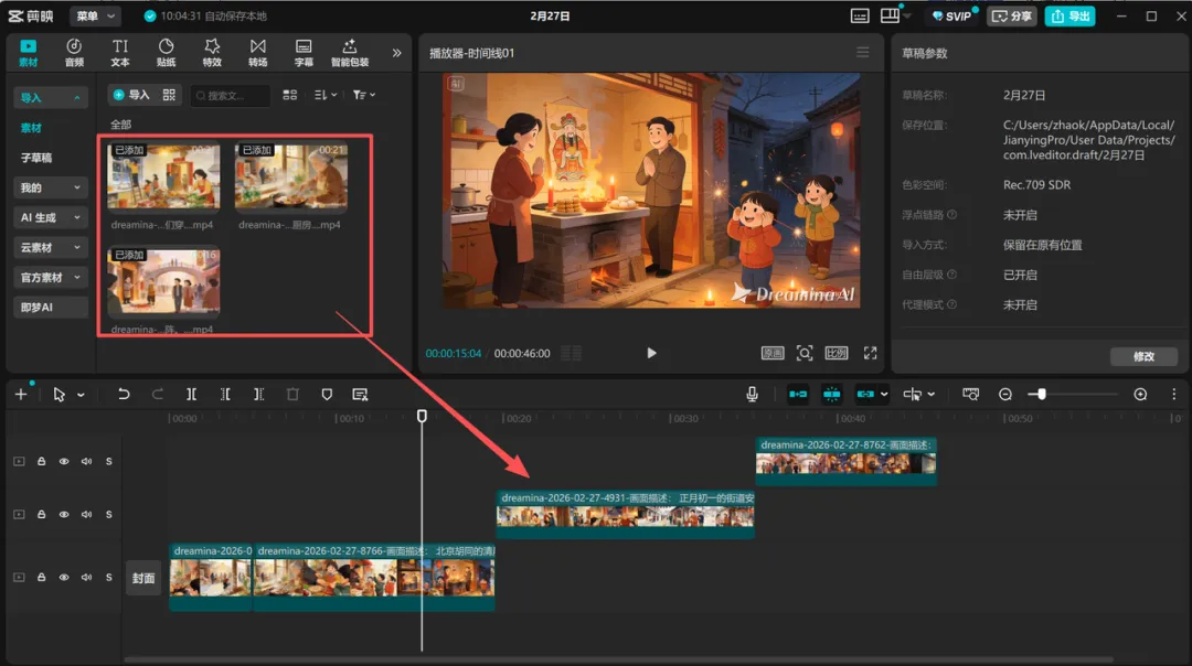 打开剪映,把所有视频片段按顺序拖入轨道。