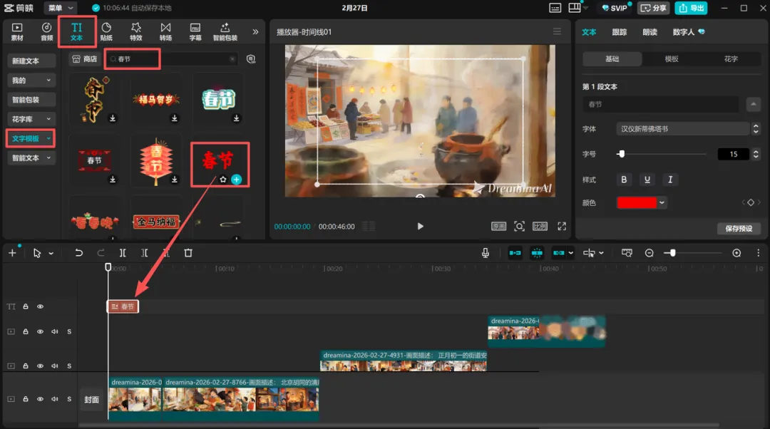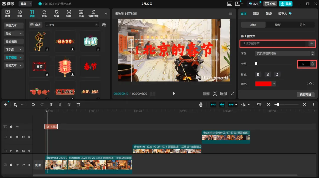 加文字:点击"文本"——"文字模板"——搜索"春节"——把喜欢的花字拖入轨道——右侧修改文本内容、字号、颜色。