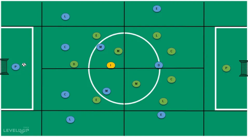 将球员分为两队,每队10 名球员外加1 名进攻自由人。两队必须根据之前练习过的战术阵型进行站位。本次练习的主要条件是强调角色转换(从一个阶段切换到另一个阶段),为此我们设立奖励:一旦丢球,球队能在丢球的同一区域完成反抢夺回球权。