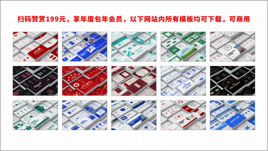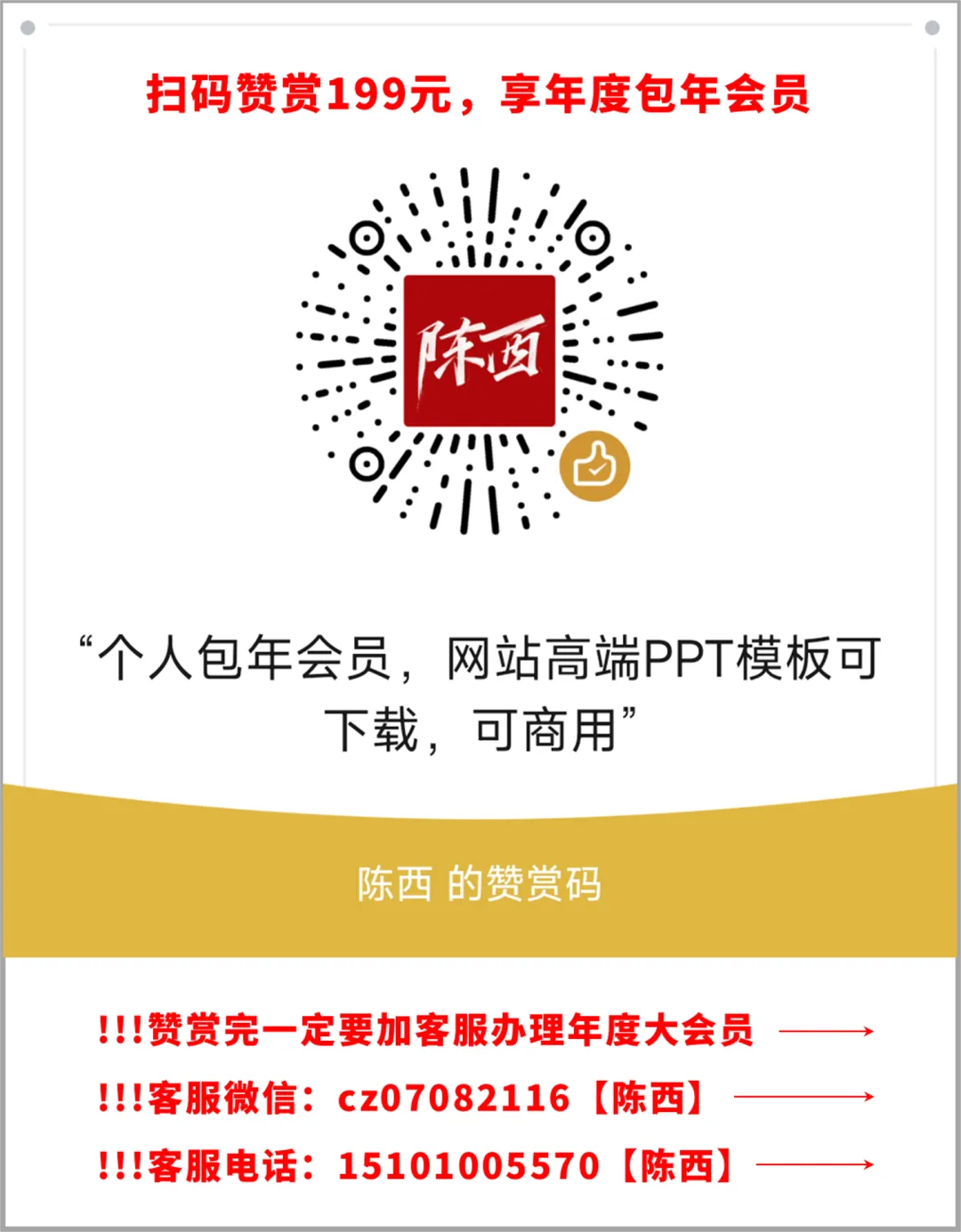 原创定制级设计,有版权,商用无忧,永久全用途商用授权!199元包年会员下载无忧。极致的用心,追求超级优质实用好看的高端全商业使用的PPT模板!此份模板会在陈西设计之家官方PPT模板网站:www.1314ppt.com下载,网站会员可免费下载。电脑端浏览器搜索网址就行,质量上乘!下载方便,更多PPT模板如下:扫描上方二维码,赞赏 199元 可享包年大会员,可免费下载高级PPT模板!