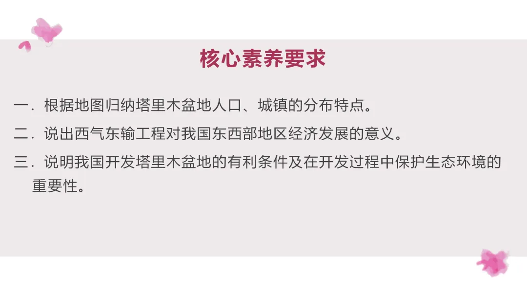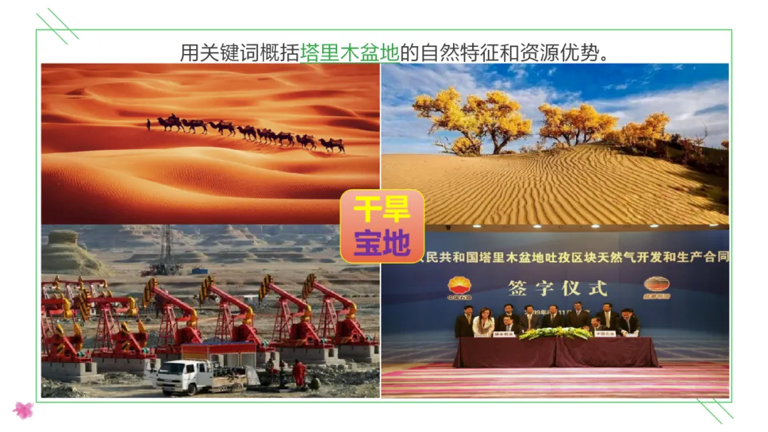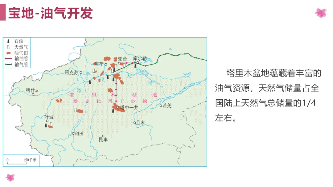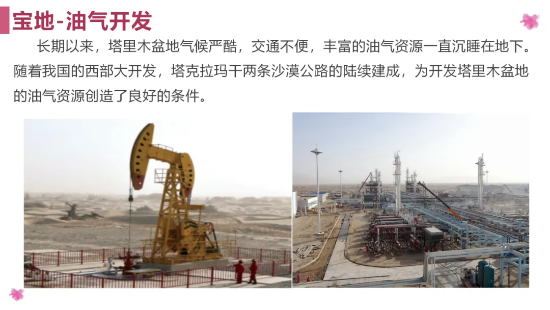 2. 通过对塔里木盆地油气资源开发、利用的学习,增强学生的环保意识,树立经济发展的大局观。