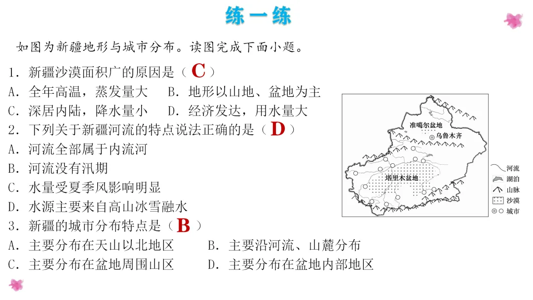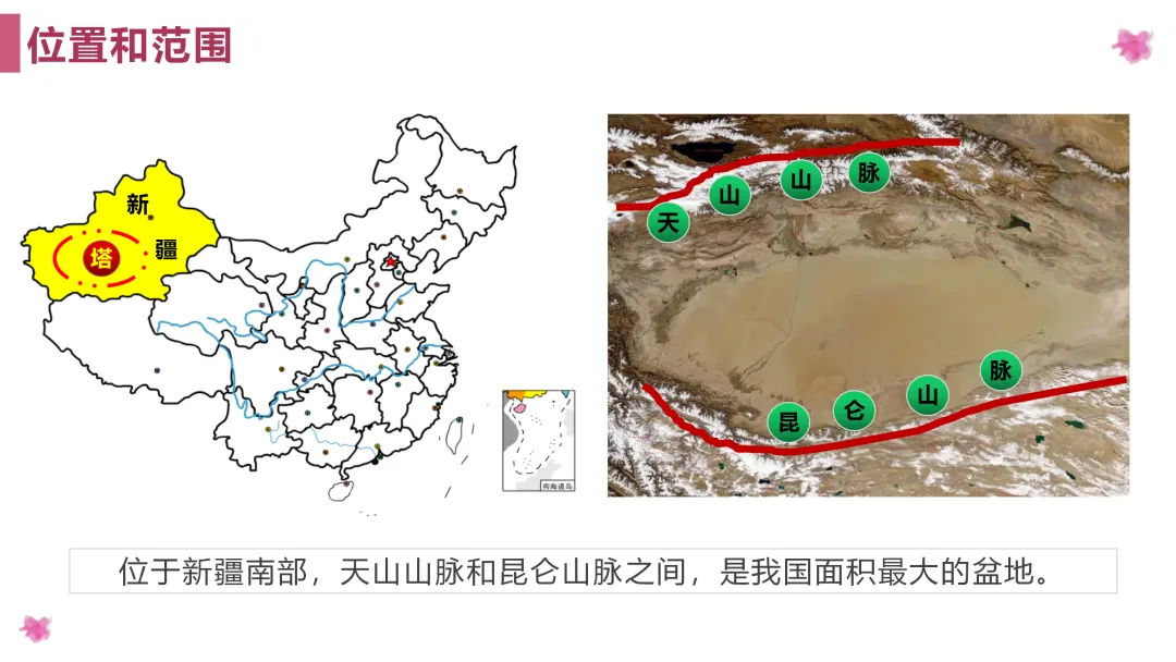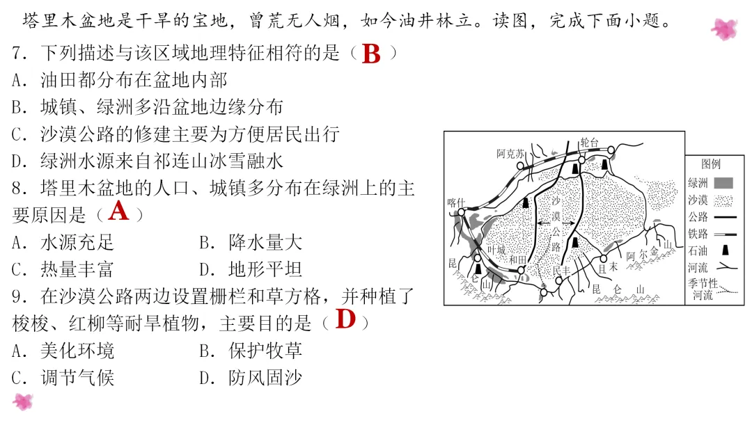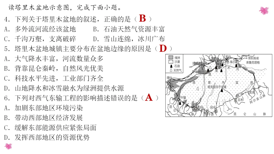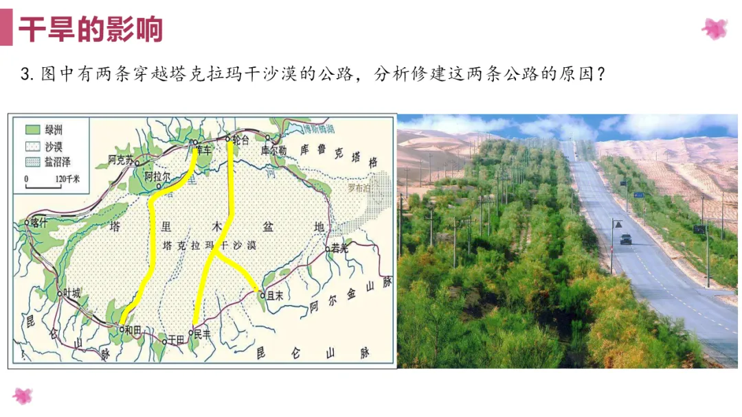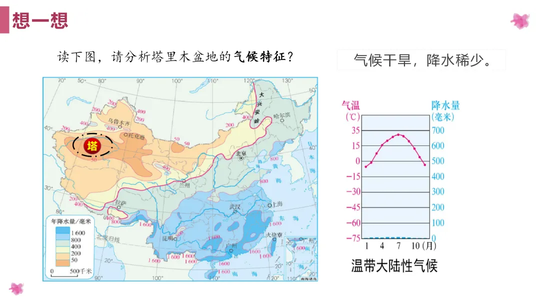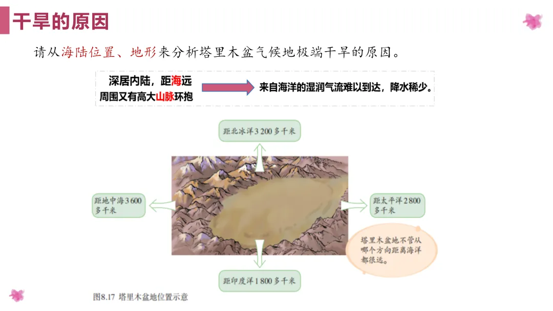 1. 利用地图掌握塔里木盆地的地理位置,分析造成干旱的成因;