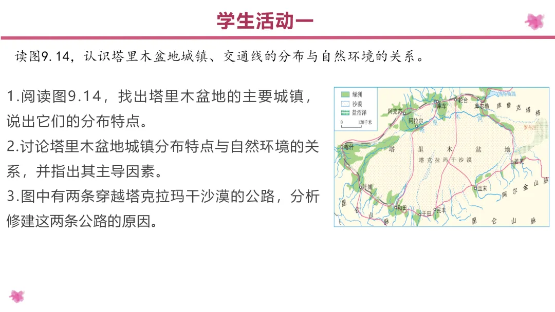2. 能看图说明本区城镇和交通的分布特点,并能分析与水源、绿洲的关系;