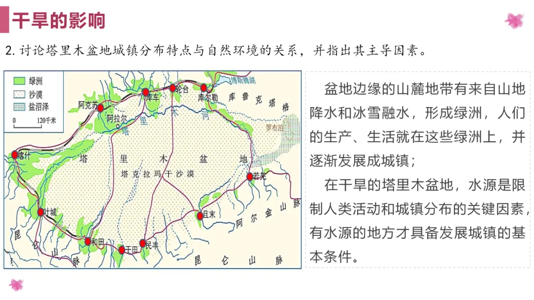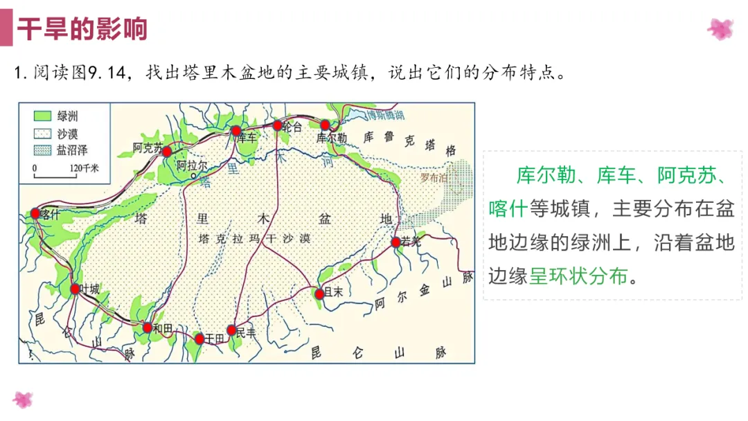 1. 塔里木盆地城镇、交通线分布与水源、绿洲分布的关系。