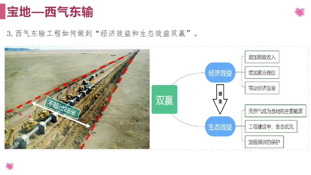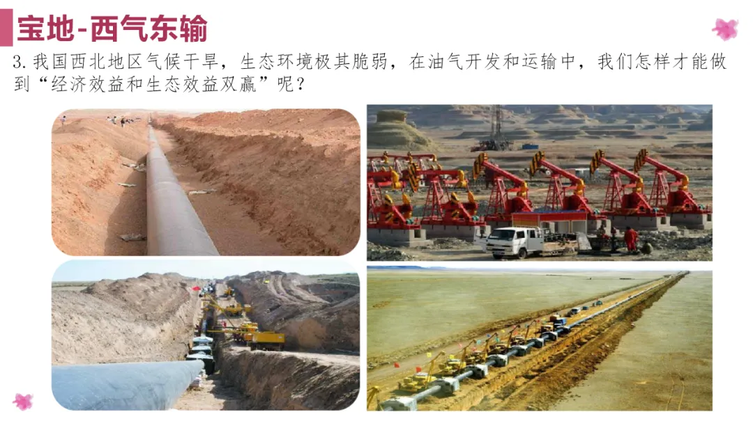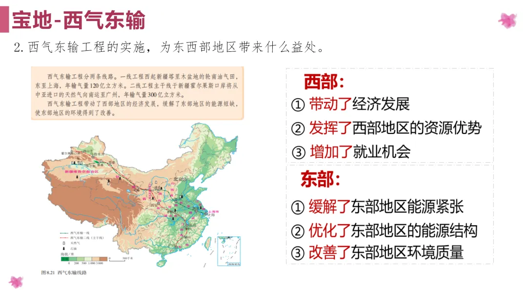 2. 通过学习西气东输工程带来的好处以及生态保护等内容,提高学生对地理知识的综合分析和运用能力。