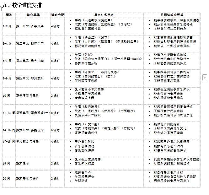 以《义务教育艺术课程标准(2022年版)》为指导,坚持立德树人根本任务,通过音乐教育培养学生审美感知、艺术表现、文化理解等核心素养。本教学计划基于人音音乐新教材八年级第一学期内容,注重传承中华优秀传统文化,拓展国际音乐视野,培养学生音乐鉴赏能力和表现能力,促进学生全面发展。