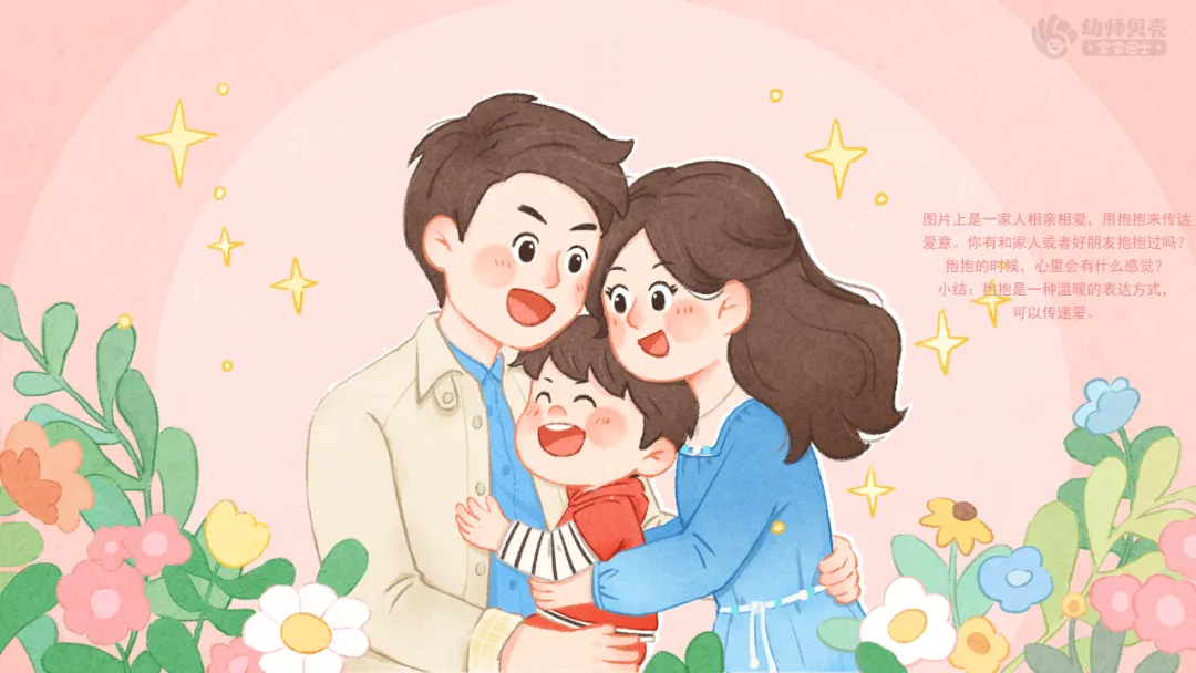 ——图片上是一家人相亲相爱,用抱抱来传达爱意。你有和家人或者好朋友抱抱过吗?抱抱的时候,心里会有什么感觉?
