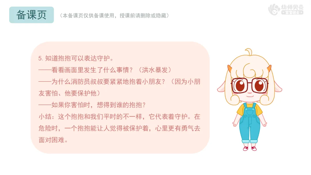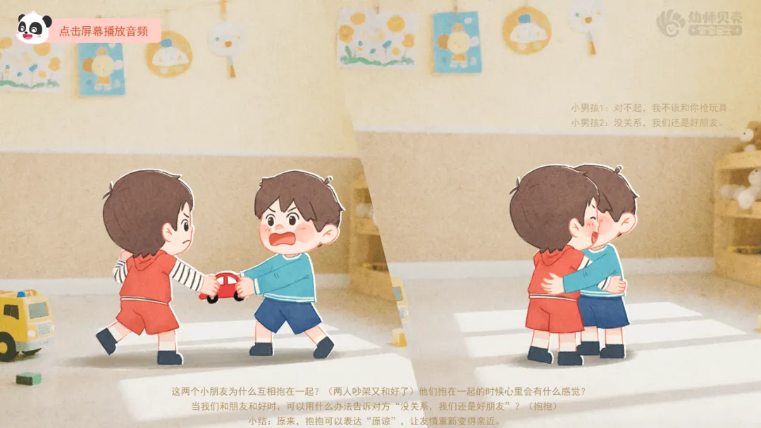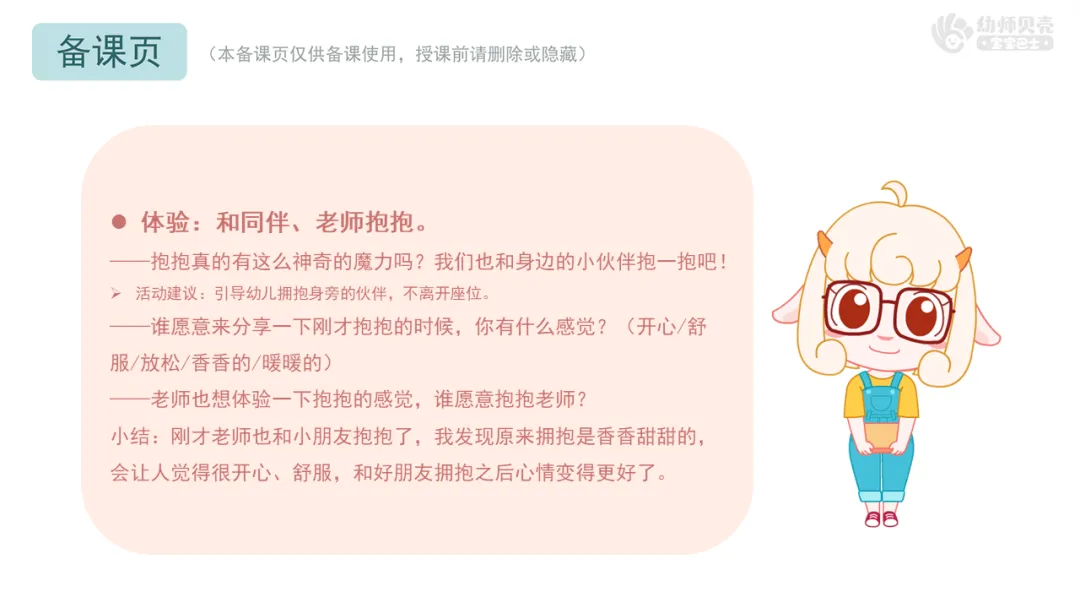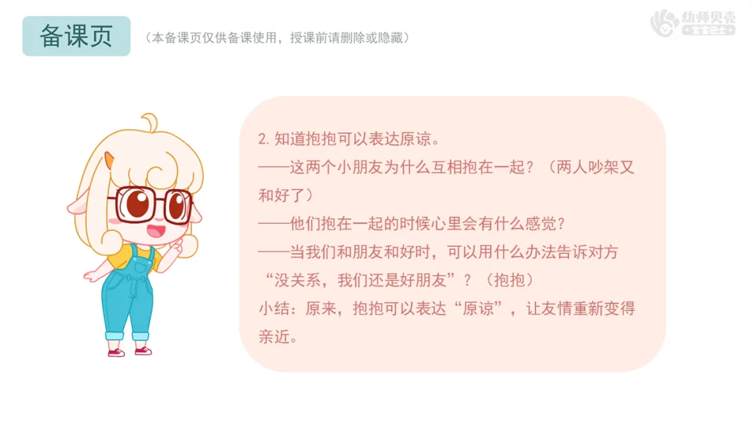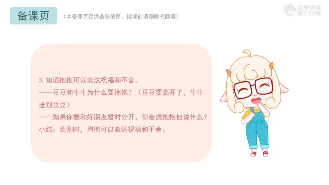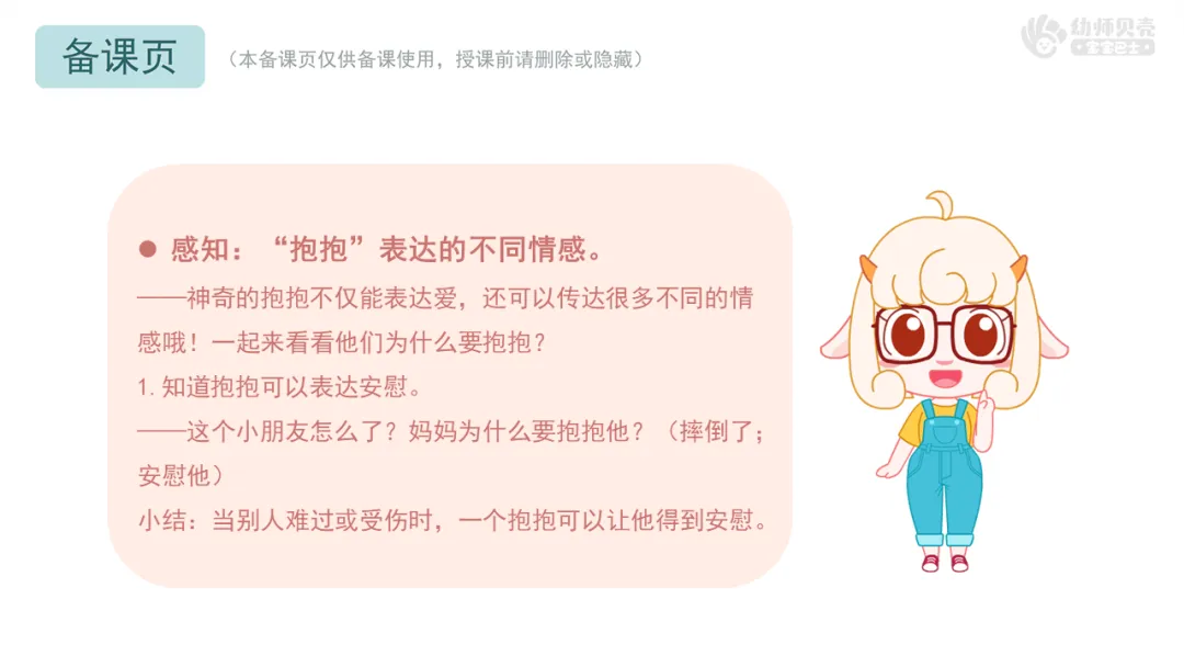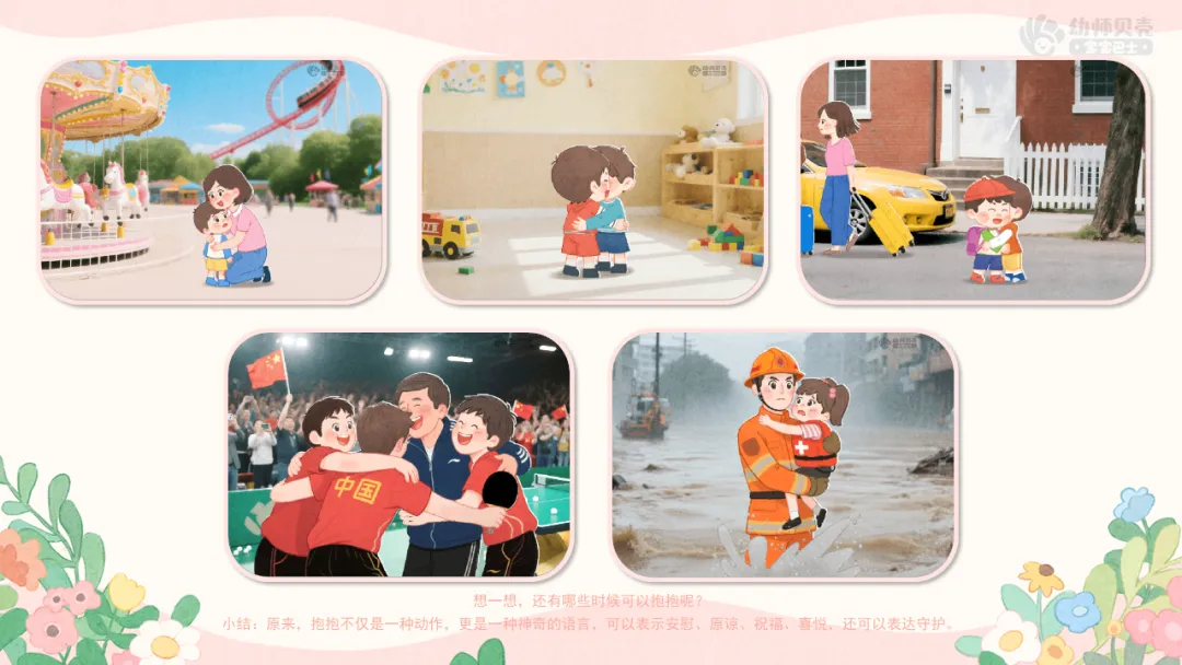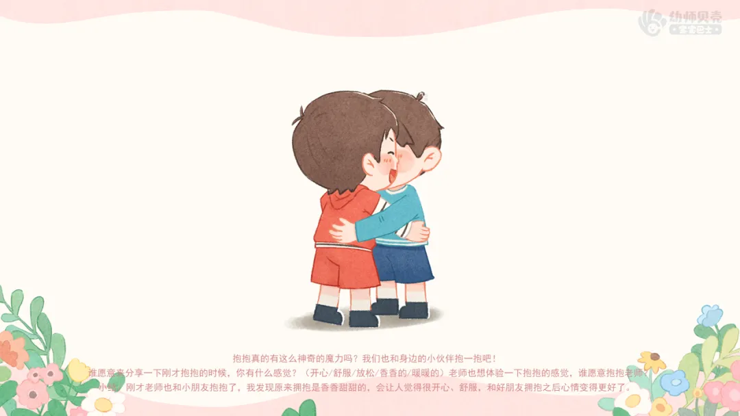 幼儿对情感的理解多依赖具体场景,此目标通过 PPT 中 “摔倒后被安慰”“和好后表达原谅”“离别时传递祝福” 等具象情境,帮助幼儿将 “拥抱” 与 “安慰、原谅、喜悦、守护” 等情感建立关联,初步认知拥抱作为 “情感语言” 的多样性,为后续理解复杂情感奠定基础。