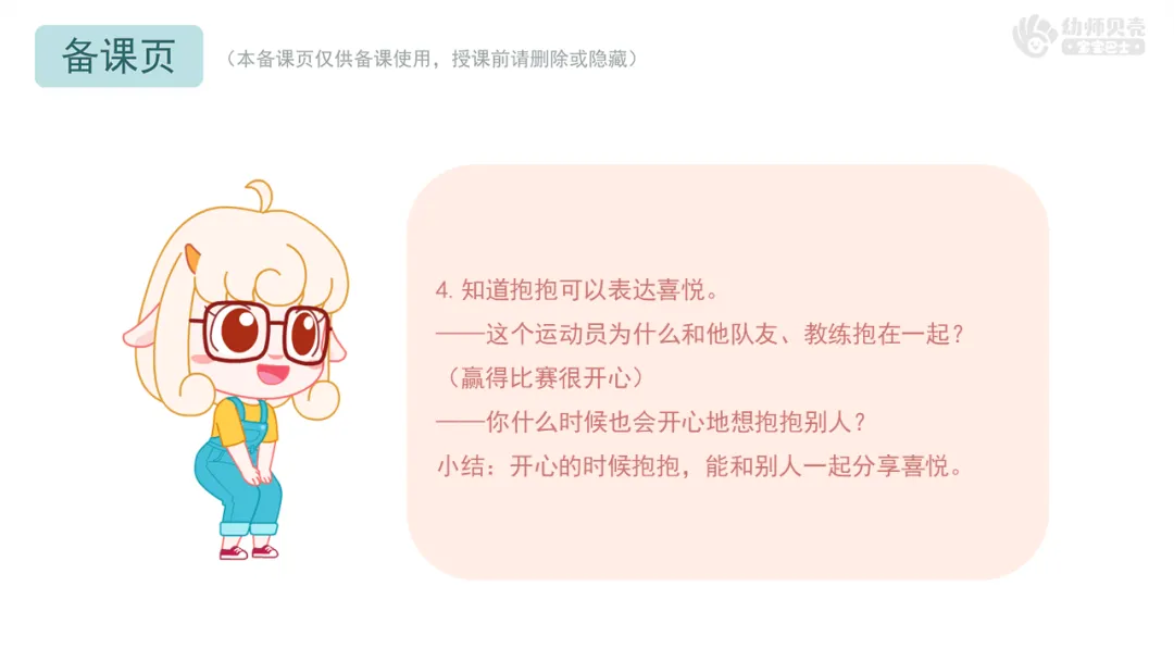 2.认知目标:初步理解拥抱的不同含义,知道喜欢、开心、安慰别人等情境下可以用拥抱表达。