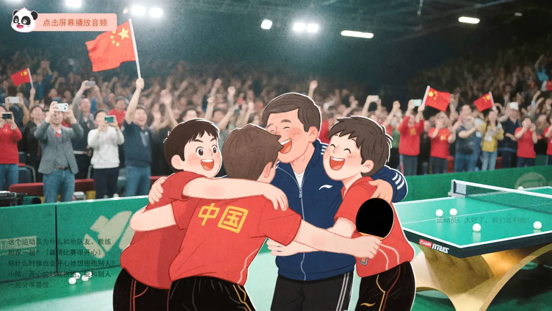 ——这个运动员为什么和他队友、教练抱在一起?(赢得比赛很开心)