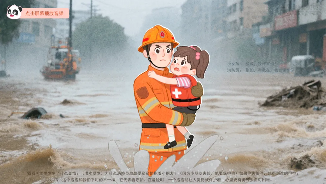 小结:开心的时候抱抱,能和别人一起分享喜悦。 5.知道抱抱可以表达守护。 ——看看画面里发生了什么事情?(洪水暴发) ——为什么消防员叔叔要紧紧地抱着小朋友?(因为小朋友害怕、他要保护他)