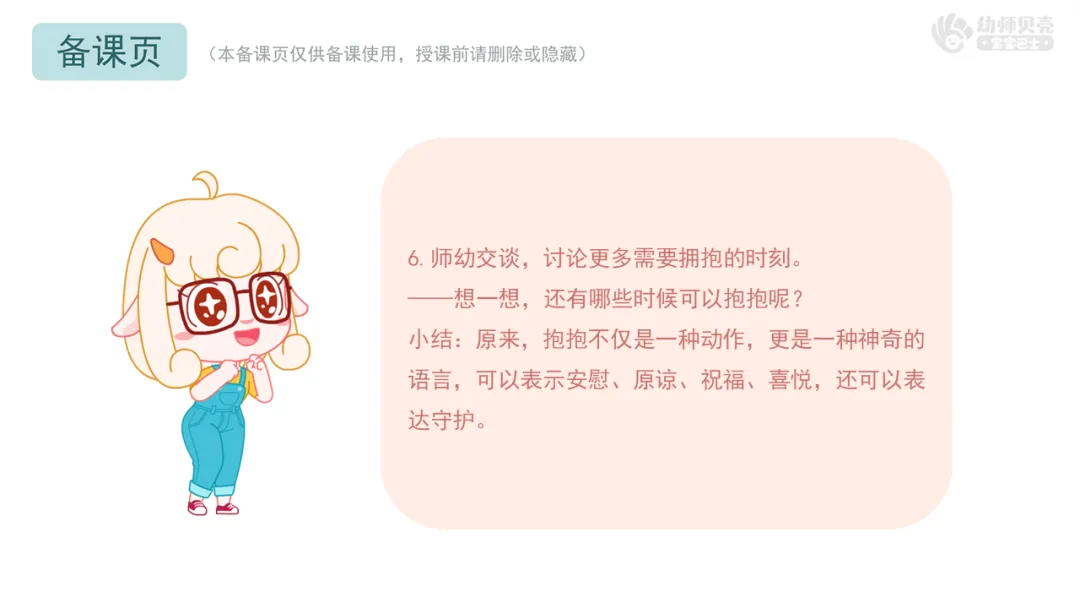 小结:原来,抱抱不仅是一种动作,更是一种神奇的语言,可以表示安慰、原谅、祝福、喜悦,还可以表达守护。