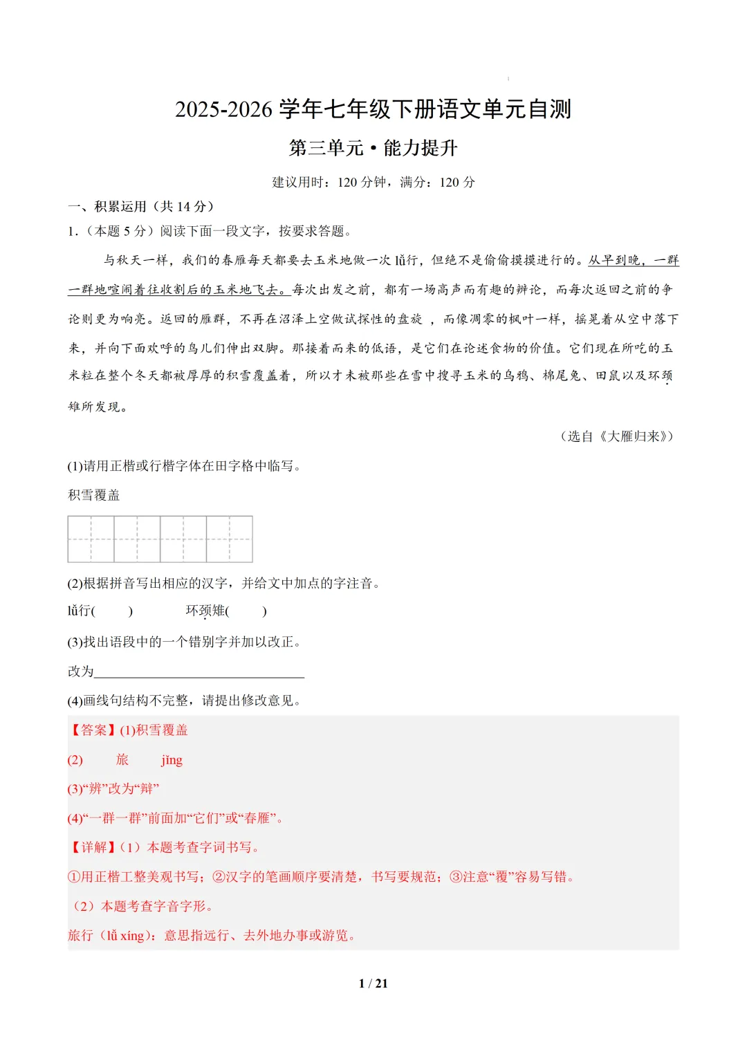 七年级语文下册第三单元(课件、教案、知识清单、专项训练、单元测试)