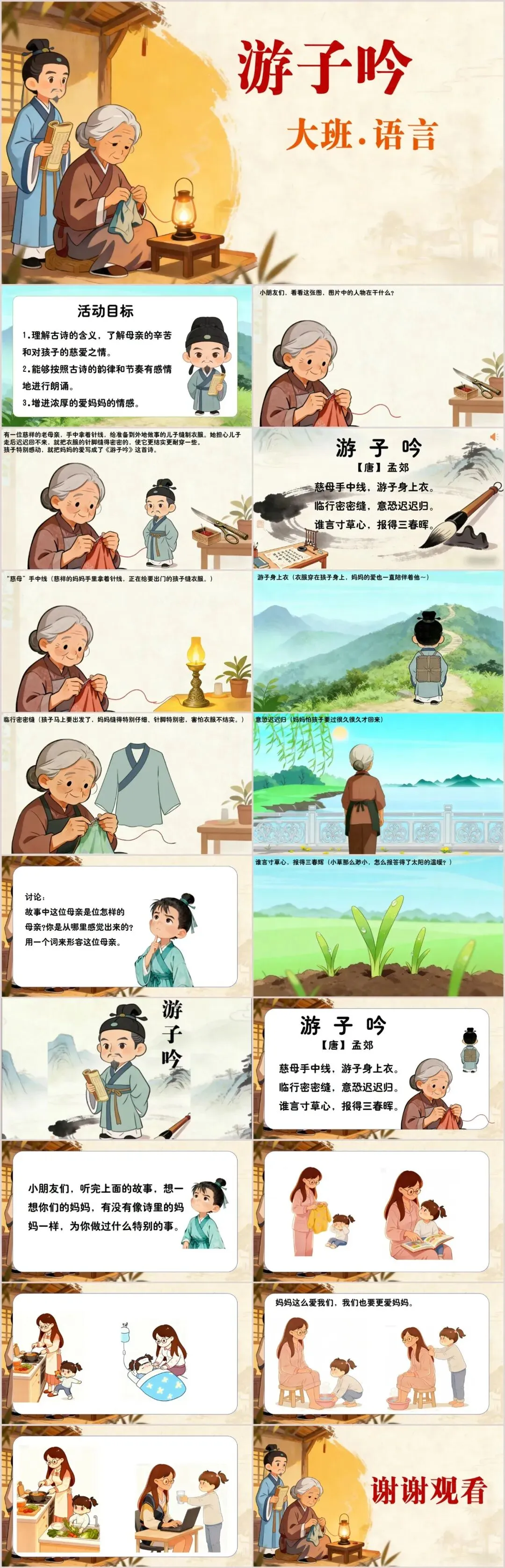 >幼儿园大班语言《游子吟》动态PPT课件+教案+说课稿