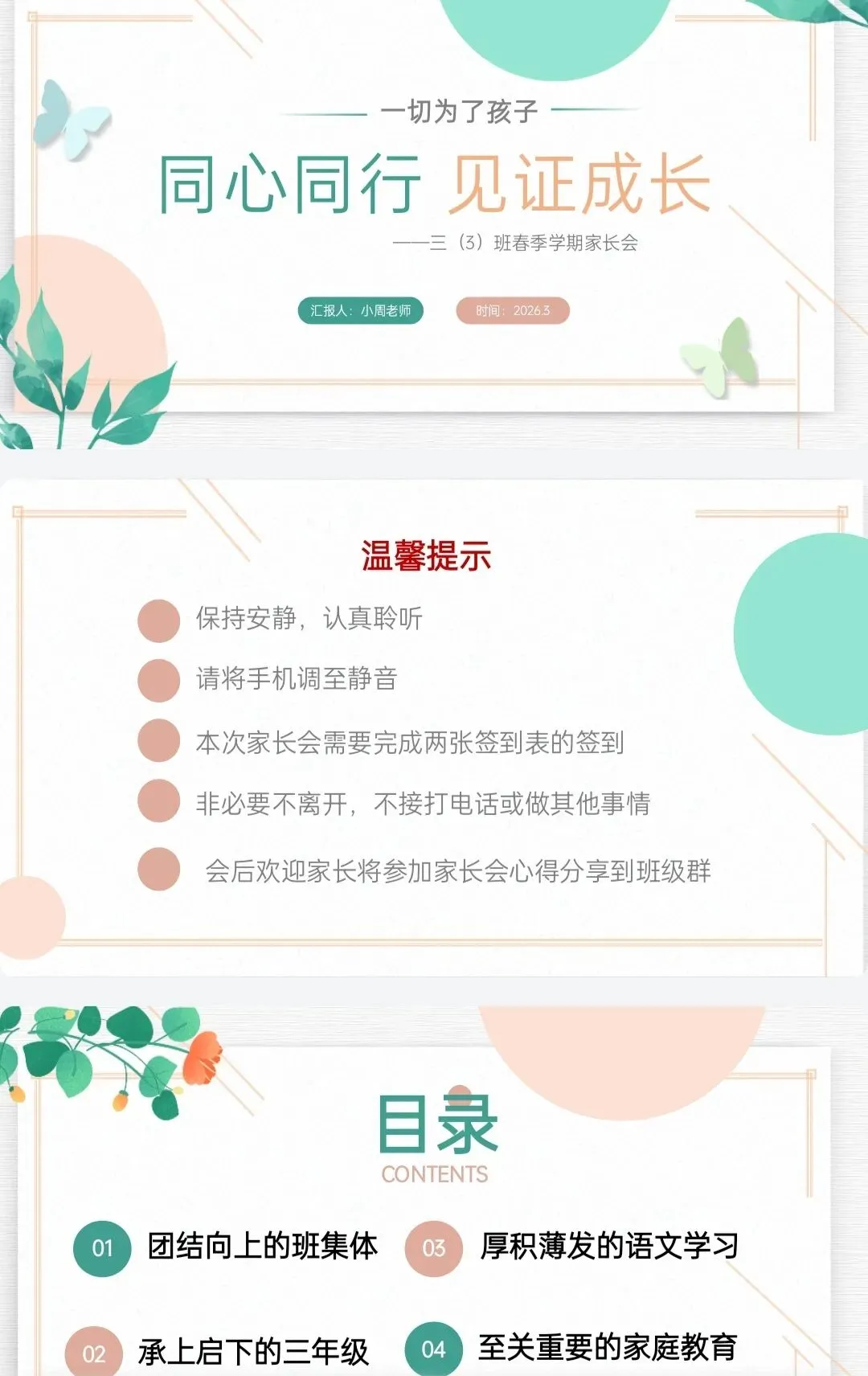 大家好,我是小周老师,又到了一学期一次的家长会时候了,每次开家长会都觉得要说很多,但是时间又有限,所以说一定要抓住重点讲,只讲痛点和难点,开完一定要让家长有所收获,这次给大家准备了三年级家长会课件和发言稿,希望能帮到大家!