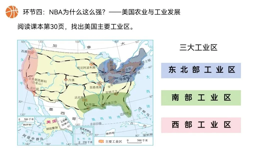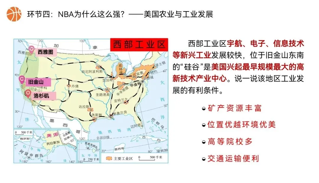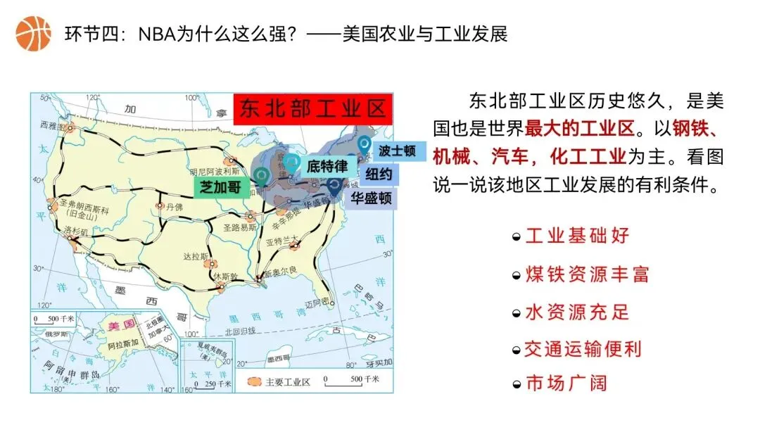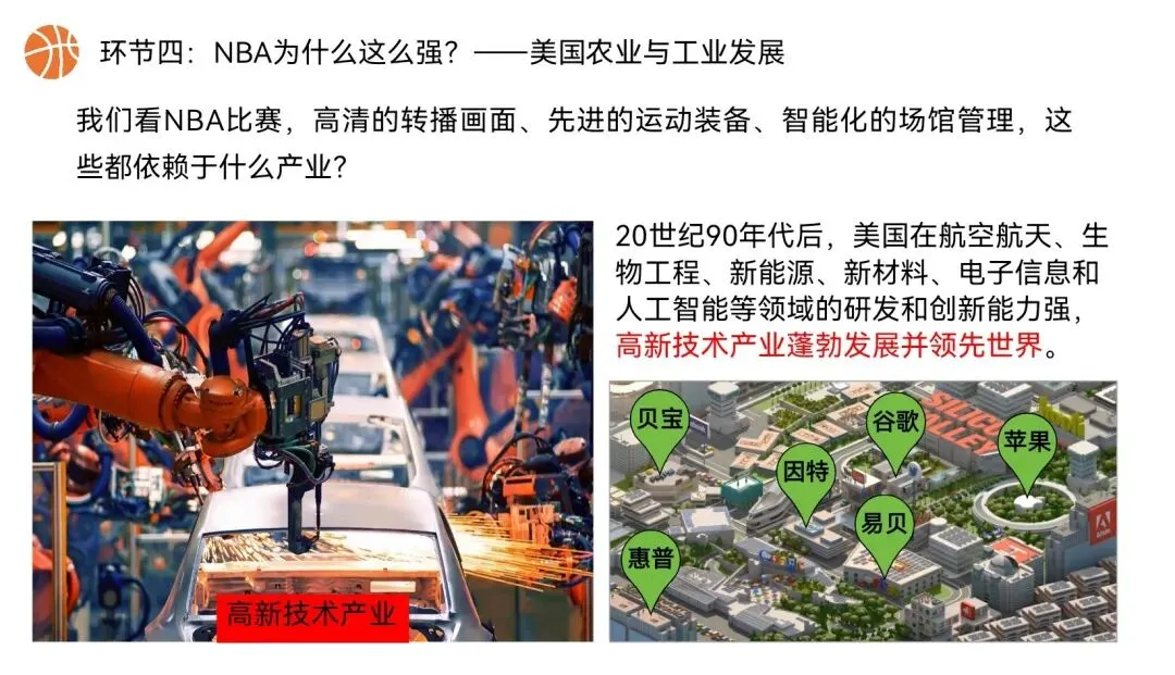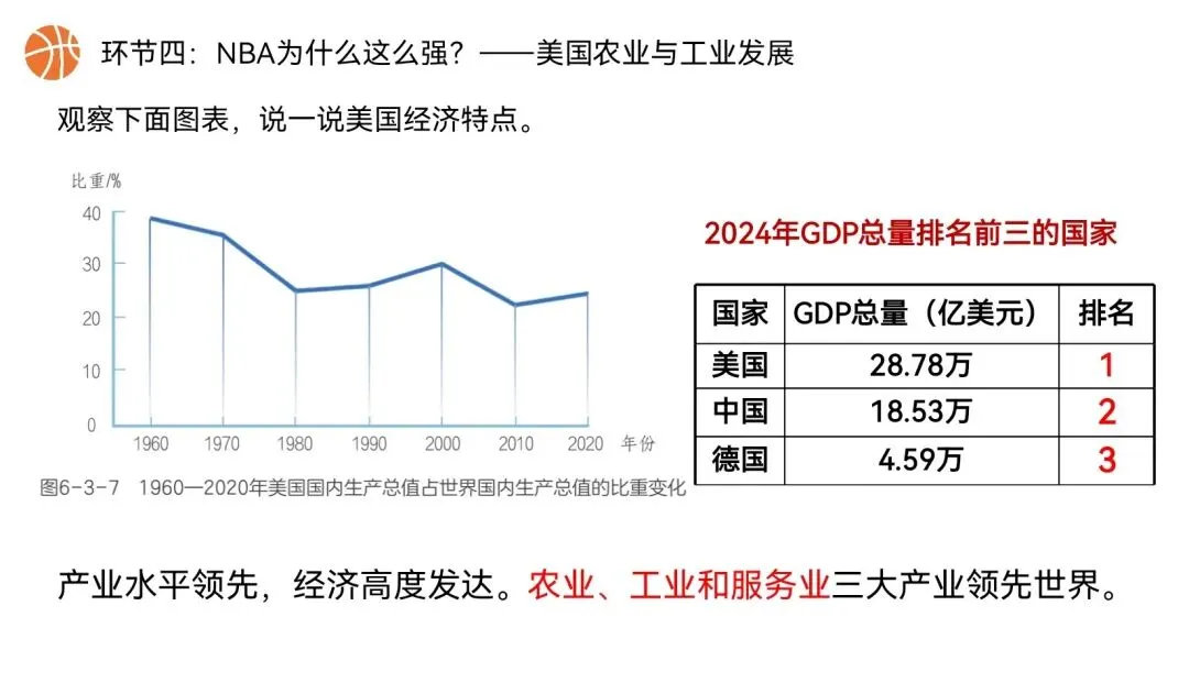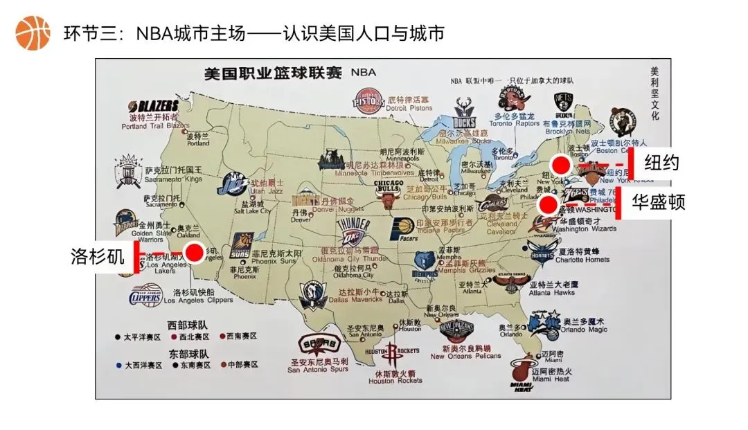 本课以NBA篮球文化为全课主线,将NBA球队分布、赛场城市、球员飞行路线、赛事后勤、球队科技装备,与美国地理位置、领土组成、地形气候、河湖、人口城市、农业、工业经济深度绑定,实现“看NBA、学美国地理”,贴合初一学生兴趣,落实地理核心素养。还在做第一课时的课件时就被孩子们围观了,超级感兴趣,课堂参与度满满~图片预览: