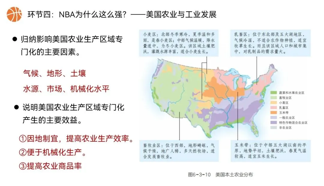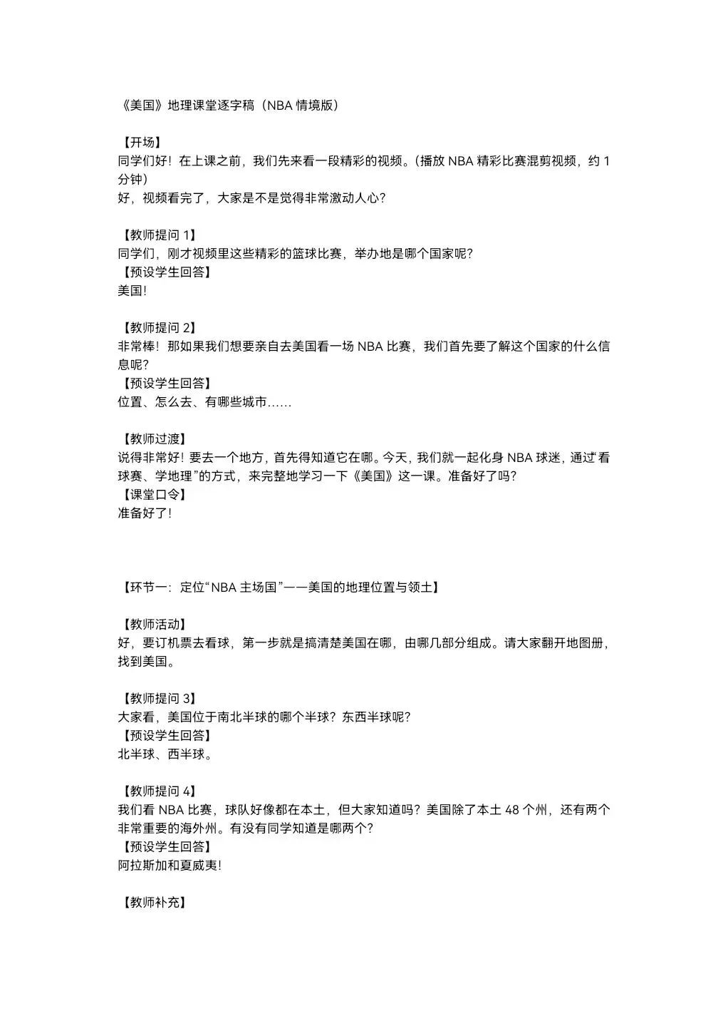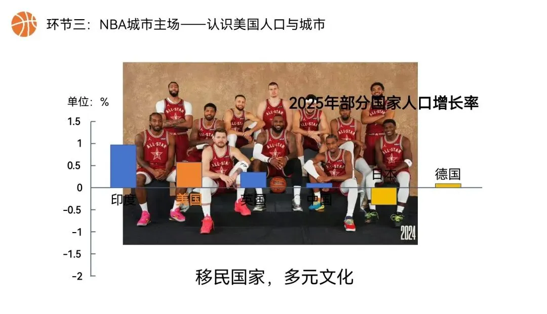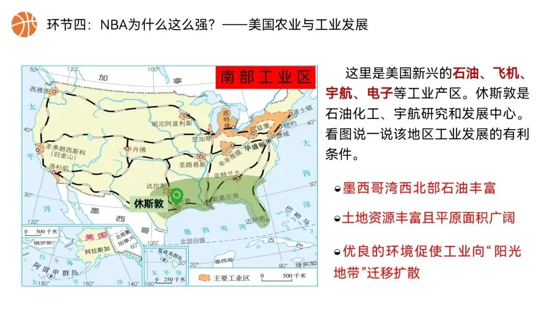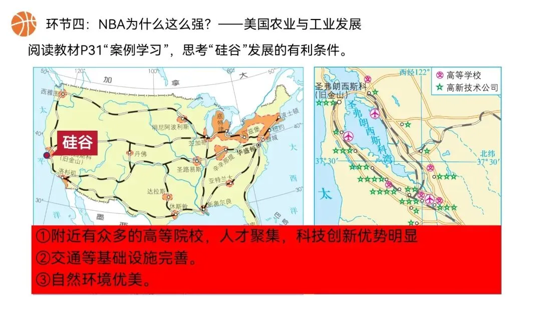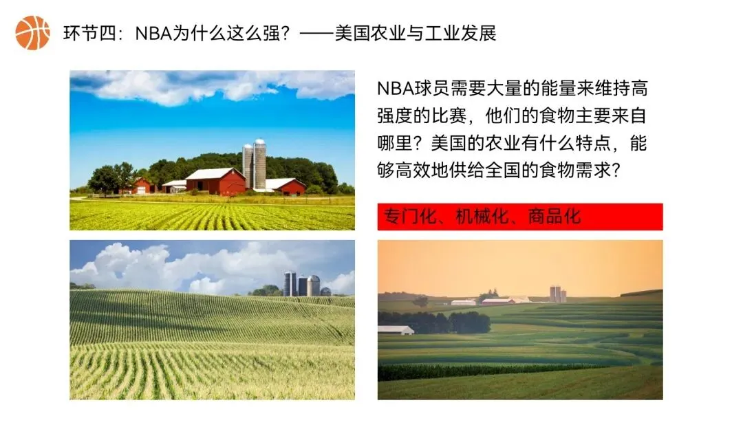 本课以NBA篮球文化为全课主线,将NBA球队分布、赛场城市、球员飞行路线、赛事后勤、球队科技装备,与美国地理位置、领土组成、地形气候、河湖、人口城市、农业、工业经济深度绑定,实现“看NBA、学美国地理”,贴合初一学生兴趣,落实地理核心素养。还在做第一课时的课件时就被孩子们围观了,超级感兴趣,课堂参与度满满~图片预览: