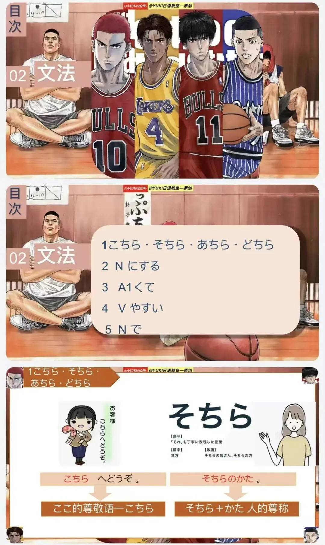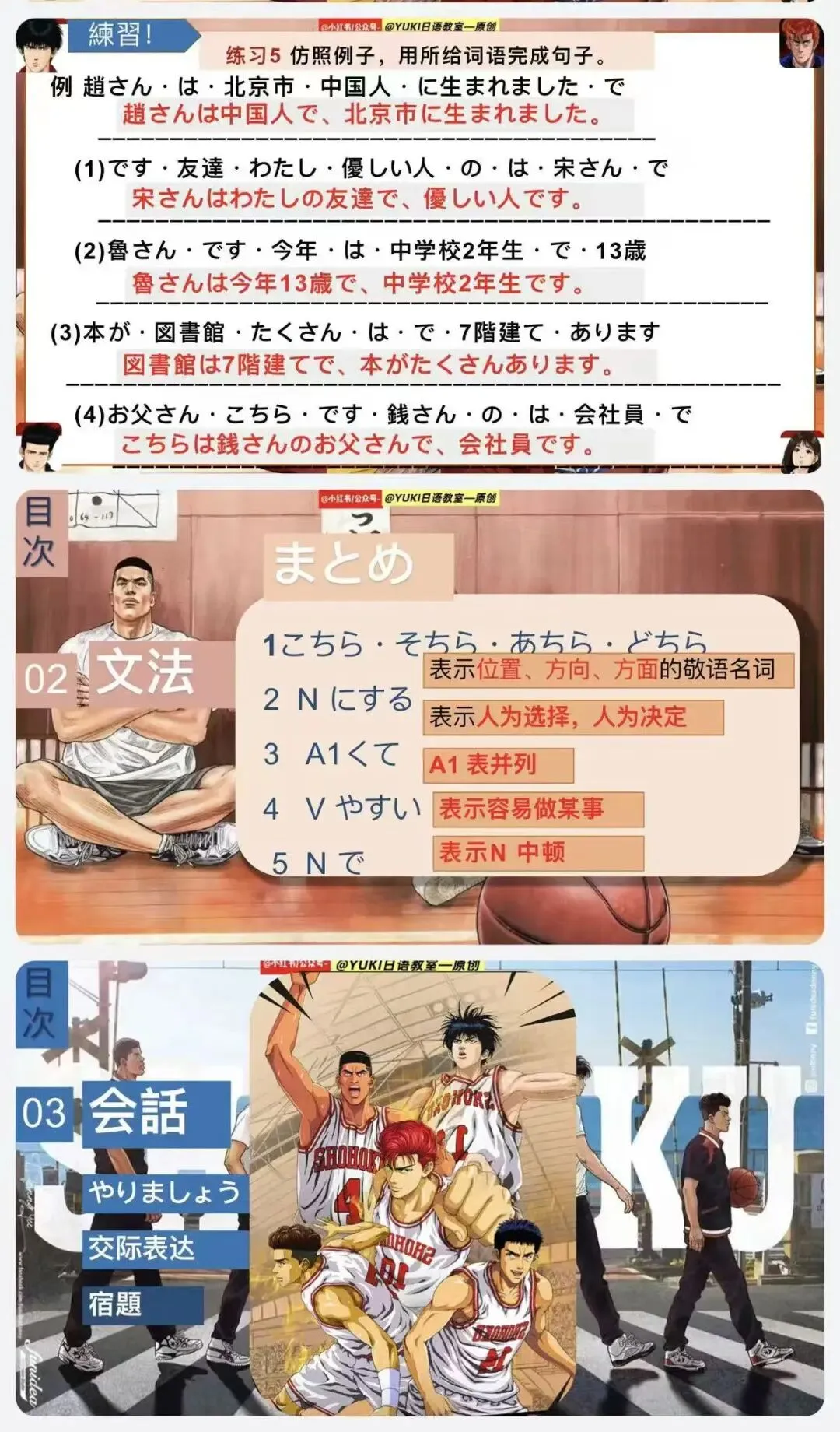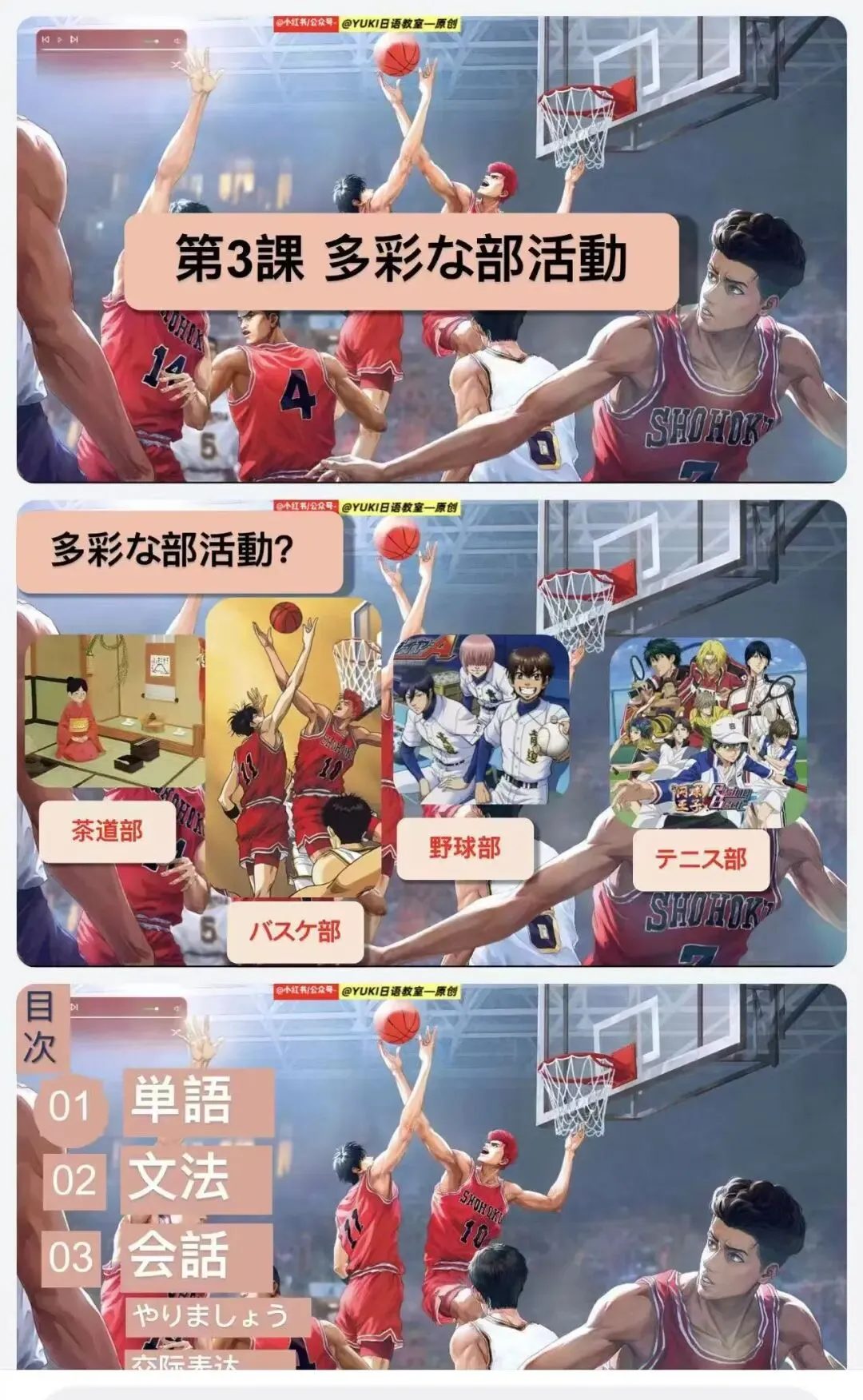 新版人教日语八年级动漫版课件第3课(灌篮高手-原创动漫版课件:)-本课件为原创课件由-@公众号--YUKI日语教室 制作。本课件未授权给任何人进行商用,禁止🚫二次引流和销售,盗版课件属于违法侵权行为,请大家谨防假冒,谢谢支持原创日语资料的制作!